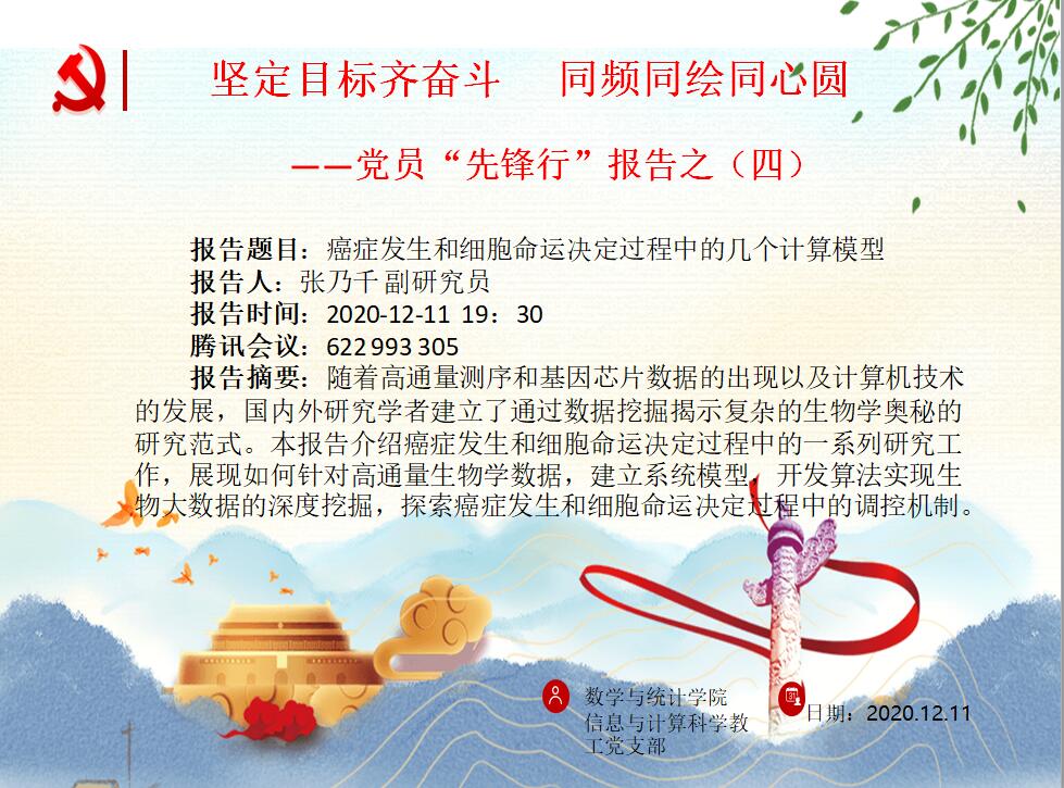 本站讯 为了进一步深化同学们对专业科研方向的了解,12月11日晚,pg电子官方网站信息与计算科学系教工党支部于腾讯会议组织开展了“坚定目标齐奋斗 同频同绘同心圆”——党员‘先锋行’报告第四期。此次活动由信息与计算科学系教工党支部书记亓兴勤主持,统计系教师张乃千担任主讲人,学院党委副书记王鹏飞、公共数学教学部教工党支部书记穆增超、信息与计算科学系教工党支部全体成员及部分学生代表参加了活动。