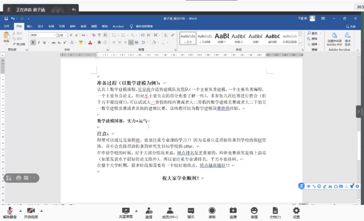 活动伊始,魏佳佳向大家介绍八位进行经验分享的嘉宾。经验分享环节中,夏炳权和郭雨萌从考研选择、心态等方面与大家分享了自己的经验,重点分享了考研学习方法和时间规划等内容,建议同学们调整好心态,踏实认真。随后,孙铭、魏佳佳、李雪彤、殷子涵分别对支教保研、保资辅导员政策、成绩保研以及单列保研四个方面进行了讲解分享,鼓励同学们可以选择不同保研路径,低年级同学积极参加各项科创实践、社会服务活动,为自己创造更多选择机会;大三同学重点关注最后一学期的学习,保研边缘的同学做好保研考研的两手准备。紧接着,张一凡和白家野分别对出国、考公经验进行了分享,提醒同学们要尽早准备,认真对待。最后,魏佳佳总结发言,她希望同学们认真做好自己的未来规划,在面临选择时认清自我,不盲目跟风,调整心态;确定目标后应迎难而上,脚踏实地,为自己的目标不懈努力。
