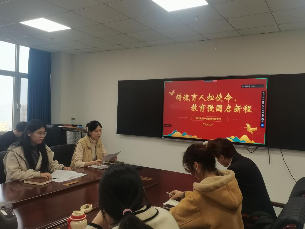 本站讯 为深入学习贯彻党的二十大关于加快建设教育强国的战略部署,2月27日下午,pg电子官方网站本科生第一党支部于北衡楼1421开展了“铸魂育人担使命,教育强国启新程”主题党日活动。会议由党支部书记王祎璠主持,支部全体党员参加。