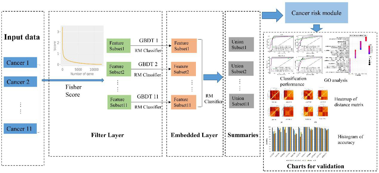 该研究提出了一种识别泛癌症基因模块的混合特征选择算法FS-GBDT。癌症是由不同细胞类型和组织失调引起的高度异质性疾病。但是,不同的癌症可能具有相同的发病机制。鉴定参与癌症产生和发展的关键基因对于癌症的治疗至关重要,对多种癌症的联合分析可能有助于发现不同癌症之间的重叠发病机制。这项研究中提出了一种融合特征选择框架,即融合Fisher分数法和梯度提升决策树的新型算法,以在高维基因表达数据集中选择关键性的特征基因。然后对11种人类癌症进行了联合分析,以探索影响癌症发病的关键特征基因子集。FS-GBDT与其他四种适用于高维数据的特征选择算法进行了比较,均取得了最好的结果。该研究最终鉴定出了31个高分特征基因并归类于不同的信号通路,其中一些基因参与重要的癌症信号通路,对癌症的产生和发展有重要影响,在未来对于新型药物研发和临床诊断有重要的参考意义。