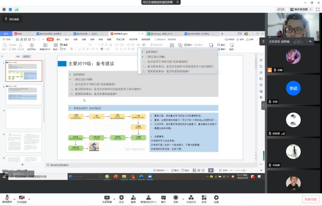 顺势而为,借势而进,筑牢思政工作生命线。面对疫情防控这次大考,学院借势而进,学工队伍通过每天的见面会、个别谈心谈话努力把润物无声的思想政治工作做到个人、做到心坎。党委副书记带头深入学生,开展了多次专题会议,用最朴实的语言和学生聊天说事,晓之以理,动之以情,引导学生理解学校防疫安排,遵守防疫相关规定,激励学生坚守共战。坚持家校互通,3月18日学院党委书记、副书记主持召开线上家长会议,畅通信息,呼吁家长与学校、学院发挥合力做学生思想工作。针对部分重点关注学生,学院建档每日进行沟通联系,详细了解这部分学生的健康、生活、学习、思想等状况,让学生能一直感受到学校、学院的关怀。各年级辅导员立足不同阶段学生需求,分别开展“考研复试经验分享会”、“考研茶话会”、“专业分流介绍会”等,学院因势而动做好学生思想工作,共绘疫情防控“同心圆”。