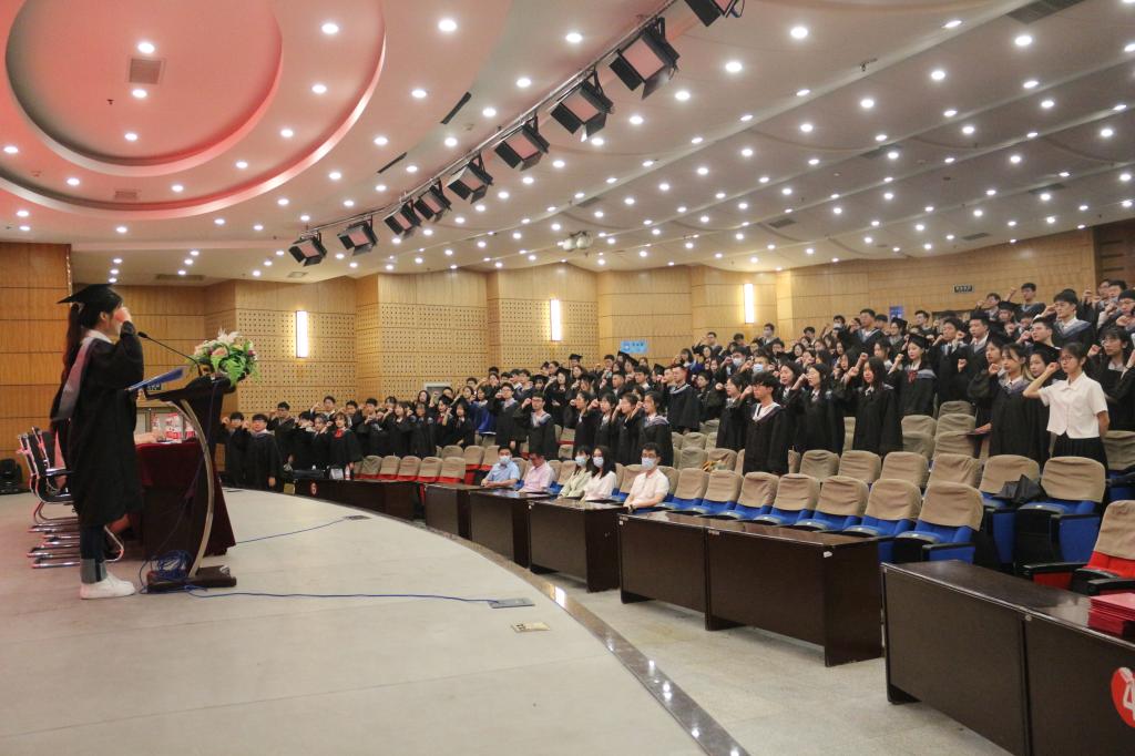 毕业生代表董珂分享了大学四年的成长与收获,表达了对学院以及老师、同窗的感激之情和对母校的依依惜别之情,表示在未来的道路上将不忘初心,勤勉自强,在青春的赛道上奋力奔跑,争取跑出当代青年的最好成绩。发言后,她带领全体毕业生进行庄严宣誓。在校生代表陈姿言对学长学姐在校期间的悉心帮助表达了感谢,表示将会以学长学姐为榜样,坚定理想,刻苦学习,努力钻研,勤于实践,与毕业生一起肩负起为母校争光、为国家效力的重任。