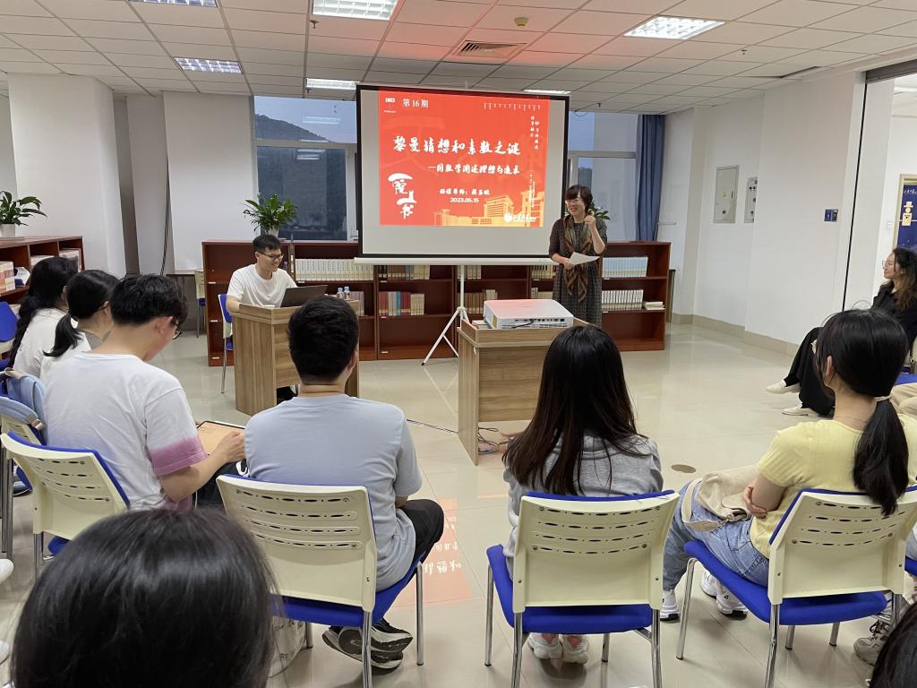 本站讯 5月15日晚,校区图书馆举行2023年“一院一书”跨学科导读活动。pg电子副教授蒋玉蛟以“黎曼猜想和素数之谜”为主题做导读讲座,图书馆直属党支部书记、馆长程蓓主持活动,四十多位师生参加现场活动。本次活动是“一院一书”品牌活动之第十六期。