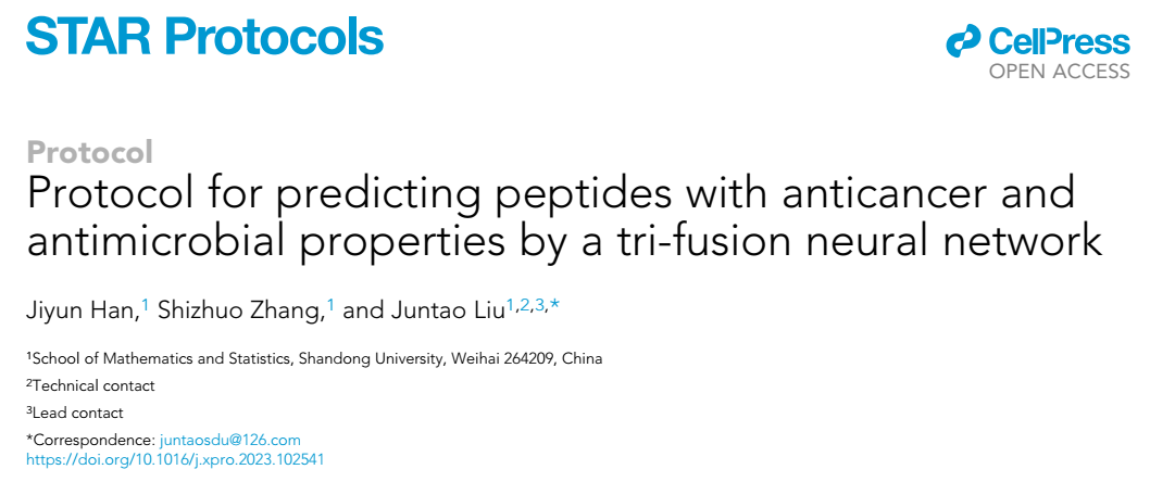 本站讯 近日,pg电子官方网站柳军涛课题组在生物学国际顶级期刊Cell的子刊Star Protocols发表了题为“Protocol for predicting peptides with anticancer and antimicrobial properties by a tri-fusion neural network”的论文,该文章展示了如何使用他们之前开发的工具TriNet预测抗癌肽和抗菌肽的运行流程。pg电子官方网站为第一完成单位,pg电子官方网站韩济蕴为论文第一作者,柳军涛为通讯作者。