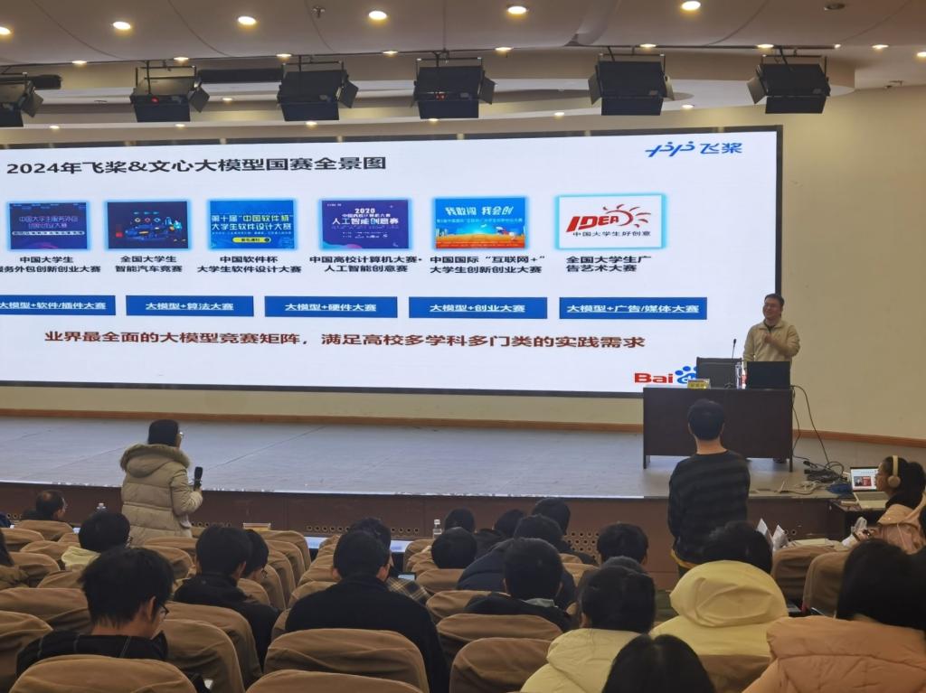 刘聪琳以“文心一言及基于大模型的科创产品实践解读”为主题,介绍了人工智能的发展历程,运用生动的案例阐释了大模型技术算法处理的底层逻辑,从理论层面深入解析了文心一言的技术原理与应用场景。他提到,文心一言作为百度自主研发的知识增强大模型,在智能问答、内容创作、深度学习等领域有着广泛的应用前景。结合大学生的发展需求,他介绍了百度文心大模型竞赛矩阵,鼓励同学们积极参与各类赛事,在实践中提升应用生成式AI的能力水平。