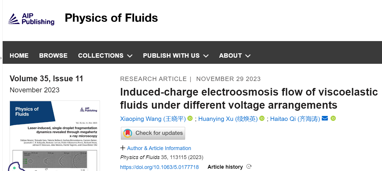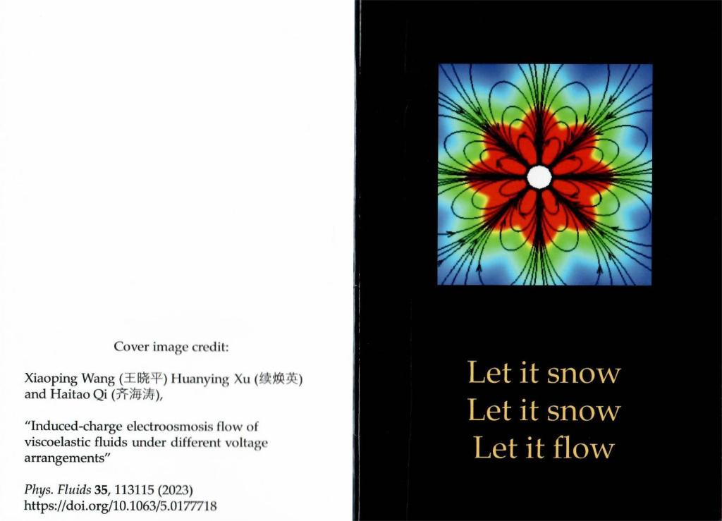 本站讯 近日,pg电子官方网站齐海涛教授团队在美国物理联合会(American Institute ofPhysics, AIP)主办的流体力学领域国际权威期刊《流体物理》(Physics of Fluids)上发表论文,题目为"Induced-charge electroosmosis flow of viscoelastic fluids under different voltage arrangements"(DOI:10.1063/5.0177718)。该工作受到了期刊主编、加拿大流变学学会主席、加拿大Queen’s University教授Alan Jeffrey Giacomin的关注,Giacomin教授将该论文作为明信片封面,邮寄给流体力学领域的研究学者。pg电子官方网站特别资助博士后王晓平为论文第一作者,齐海涛教授为通讯作者。该项工作得到国家自然科学基金面上项目和中国博士后科学基金特别资助(站前)项目资助。这是该团队第三次在该期刊上发表研究成果。