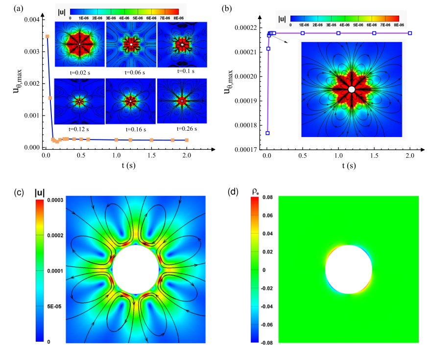 实现微尺度下粘弹性溶液的高混合效率是微流控领域中一个备受关注和充满挑战的课题,对于微流控设备在生物医药和化学分析等领域中的应用有着重要推动作用,已成为近年来国际流体力学研究的一个前沿领域。齐海涛教授团队提出一种基于不同电压排列的混沌诱导电渗流动新策略,可应用于改善粘弹性流体的混合。数值结果表明,通过不同电压排列可以在可极化圆柱附近诱导形成八个反对称涡旋,从而加大溶液的接触面积,增强微流控设备中粘弹性溶液的混合效率。该研究成果对于认识粘弹性流体(如血液、DNA溶液等)在微流控芯片中的流动问题具有重要的指导意义,可以为高效能微型混合器的设计和开发提供理论支撑和技术支持。