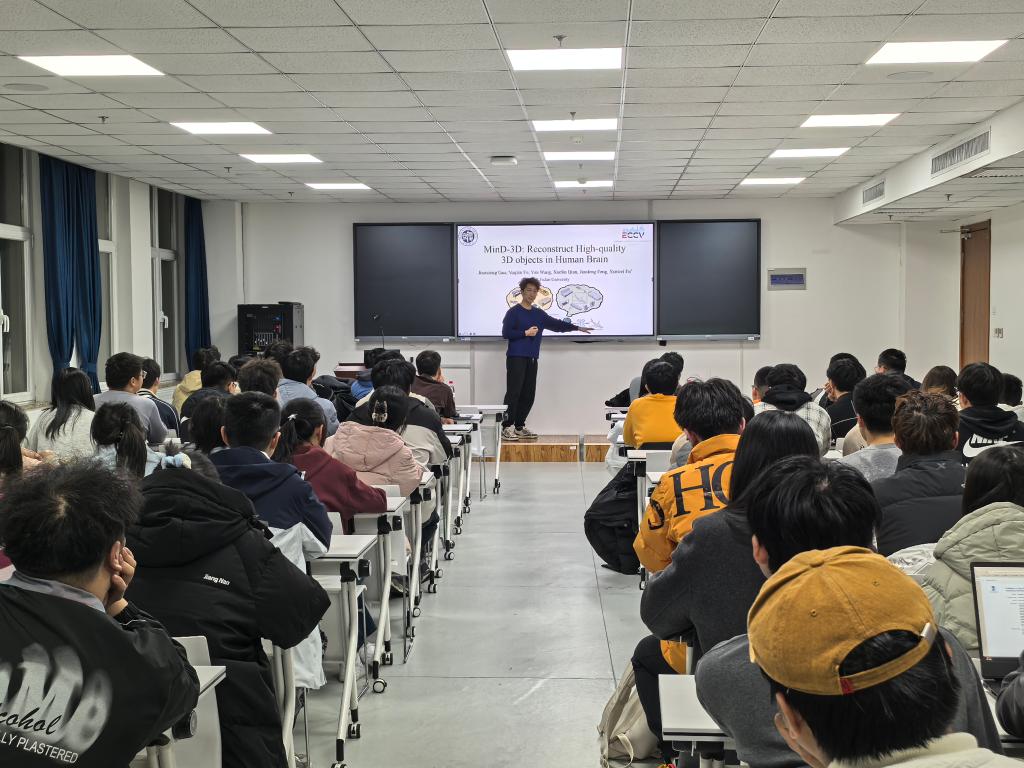 高剑雄,现为复旦大学类脑智能科学与技术研究院博士生。讲座中,他以“基于大模型的脑信号视觉信息解码”为主题,深入浅出地介绍了其所在团队在脑机接口领域的前沿研究,并分享了在科研过程中所面临的挑战、解决思路以及取得的成果。在交流环节,同学们积极提问,高剑雄耐心解答了大家关于计算机视觉研究方向、推免申请、实习面试等方面的问题。他鼓励同学们勇于探索、积极实践,并分享了自己在博士就读期间的心路历程。