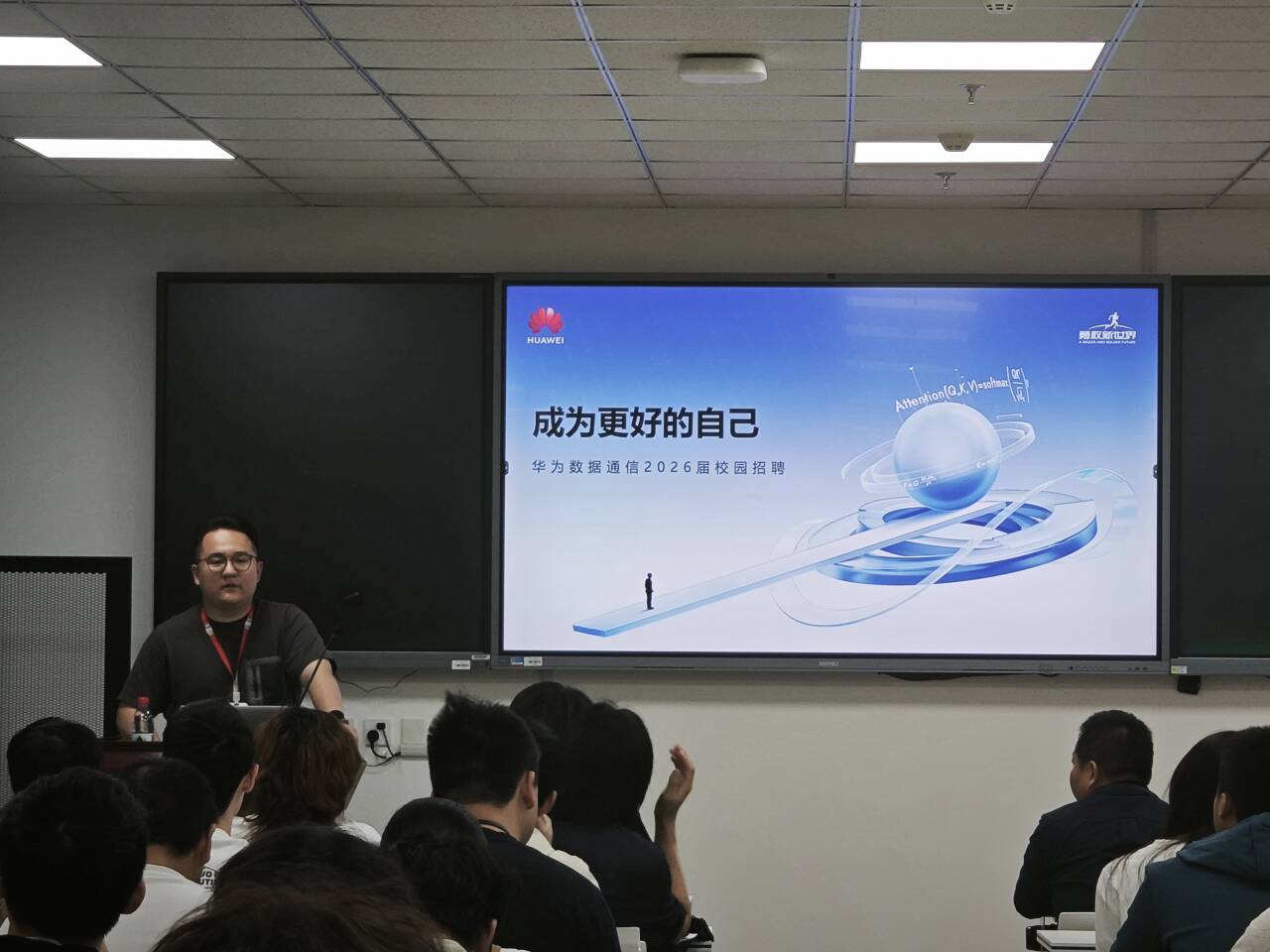 数据通信技术专家王锡森以多位华为天才少年的奋斗历程和多个工作中常见的算法问题为例,生动详细地解析了华为数通技术人才的招聘需求。他强调,扎实的数学基础、过硬的逻辑思维、系统的编程训练等是求职者顺利通关的法宝,同学们要不断提升专业能力,主动适应行业发展趋势。随后,数据通信路由器产品部项目经理管培国介绍了pg电子官方网站华为数通拔尖人才创新实践基地的建设过程和运行模式,深入剖析了实习基地各个岗位的能力要求,帮助同学们更直观地了解岗位职责与成长路径。最后,数据通信路由器招聘负责人许碧绿等详细讲解了华为的校招流程、选拔标准及实习基地培养机制,鼓励同学们结合自身优势,做好职业规划,精准定位未来方向。在互动环节,同学们就职业发展、技能提升和面试技巧等方面踊跃提问,嘉宾们一一耐心解答,现场气氛热烈。