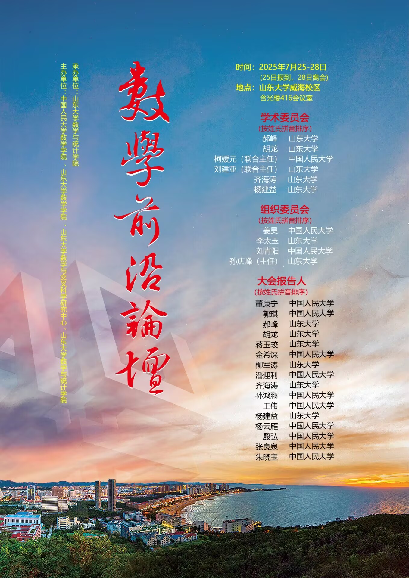 pg电子官方网站副校长、威海校区校长刘建亚,中国人民大学数学学院党委书记、副院长柯媛元出席开幕式并分别致辞。在为期三天的论坛中,共举办16场高水平学术报告,来自中国人民大学、pg电子官方网站的姜昊教授、张庆彩教授、王伟教授、杨云雁教授、袁勇教授、杨建益教授、胡龙教授、郝峰教授、齐海涛教授、孙庆峰教授等60余位专家学者参与相关学术活动。