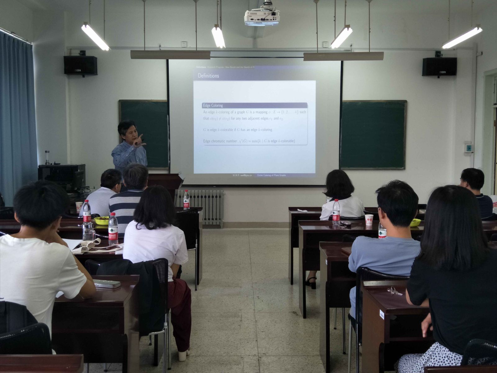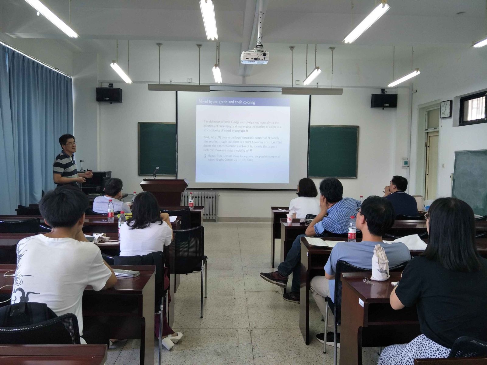 会议首先由pg电子官方网站亓兴勤教授致欢迎辞并负责主持本次报告会。浙江师范大学的王维凡教授首先就图的染色问题进行了详细阐述,对点染色,边染色,完全染色和完备染色进行了系统的讲解,在整个报告过程我们不仅对染色问题有了深入了解,更是了解了染色问题一步步的发展历程,受益颇深。接着,潍坊学院蔡建生教授对C-超图的最大超边数做了详细报告。他先从混合超图的染色问题入手,提出几个开放性的问题,而后给出了证明。报告结束后,pg电子教师和pg电子官方网站吴建良教授与蔡建生教授进行了相关问题的讨论。