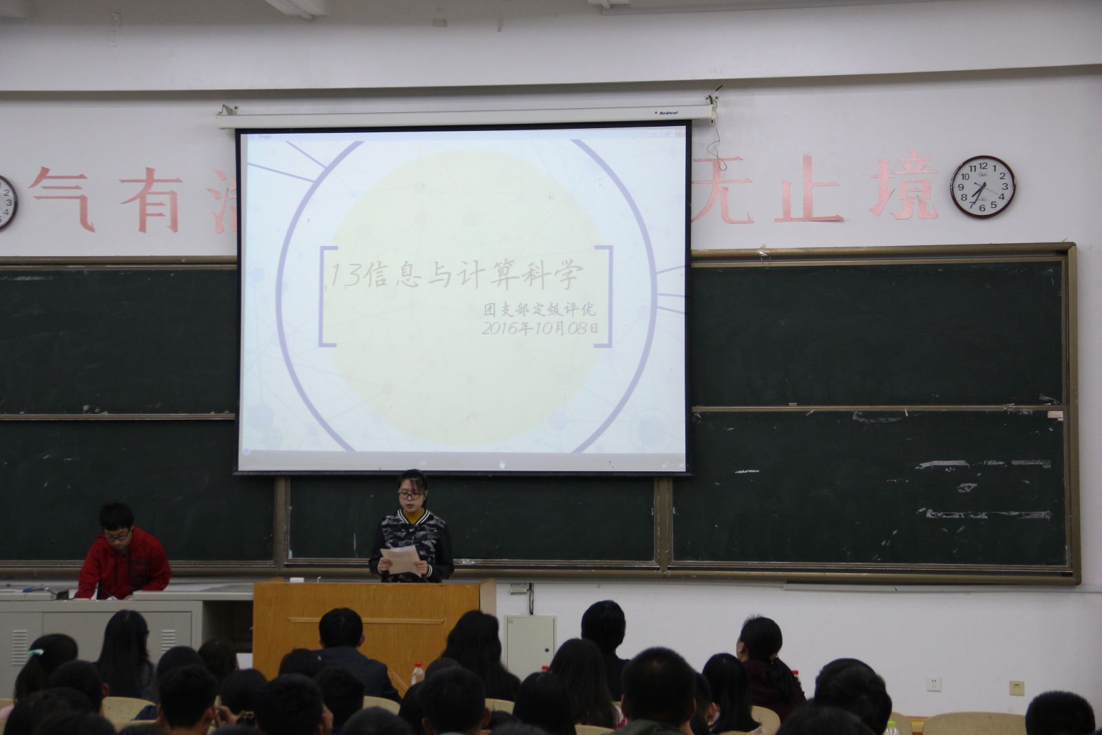 本站讯 10月8日晚,pg电子官方网站团支部定级评优风采展示会在电子楼102举行。pg电子官方网站2013、2014、2015级13个团支部进行了定级评优风采展示,pg电子官方网站2016级全体班委到场观摩学习,党总支副书记单丙波、团总支书记陈昕、全体辅导员、学生会主席王梦冉参加了会议。