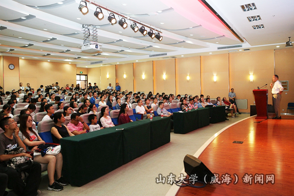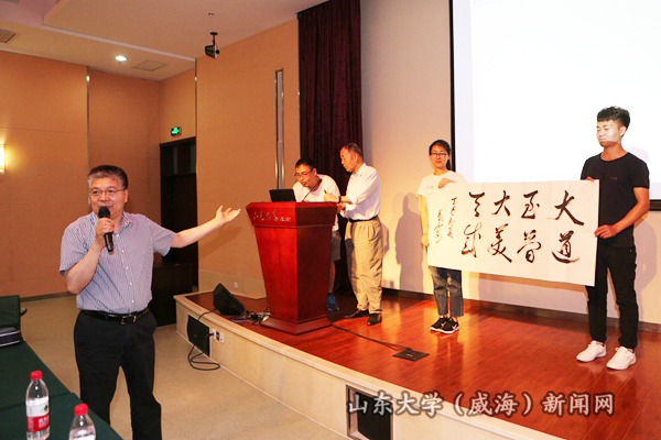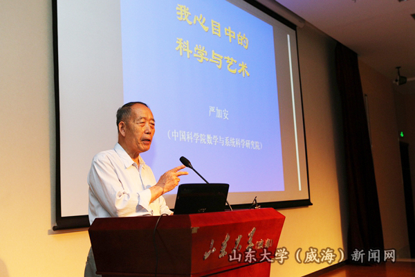本站讯 6月9日晚,中国科学院院士、数学与系统科学研究院研究员严加安第四期稷下讲坛,在闻天楼报告厅为五百多名师生作了题为“我心目中的科学与艺术”的学术报告。pg电子官方网站副校长、威海校区校长刘建亚主持报告会,并代表校区接受了严加安捐赠的由其创作的书法作品。