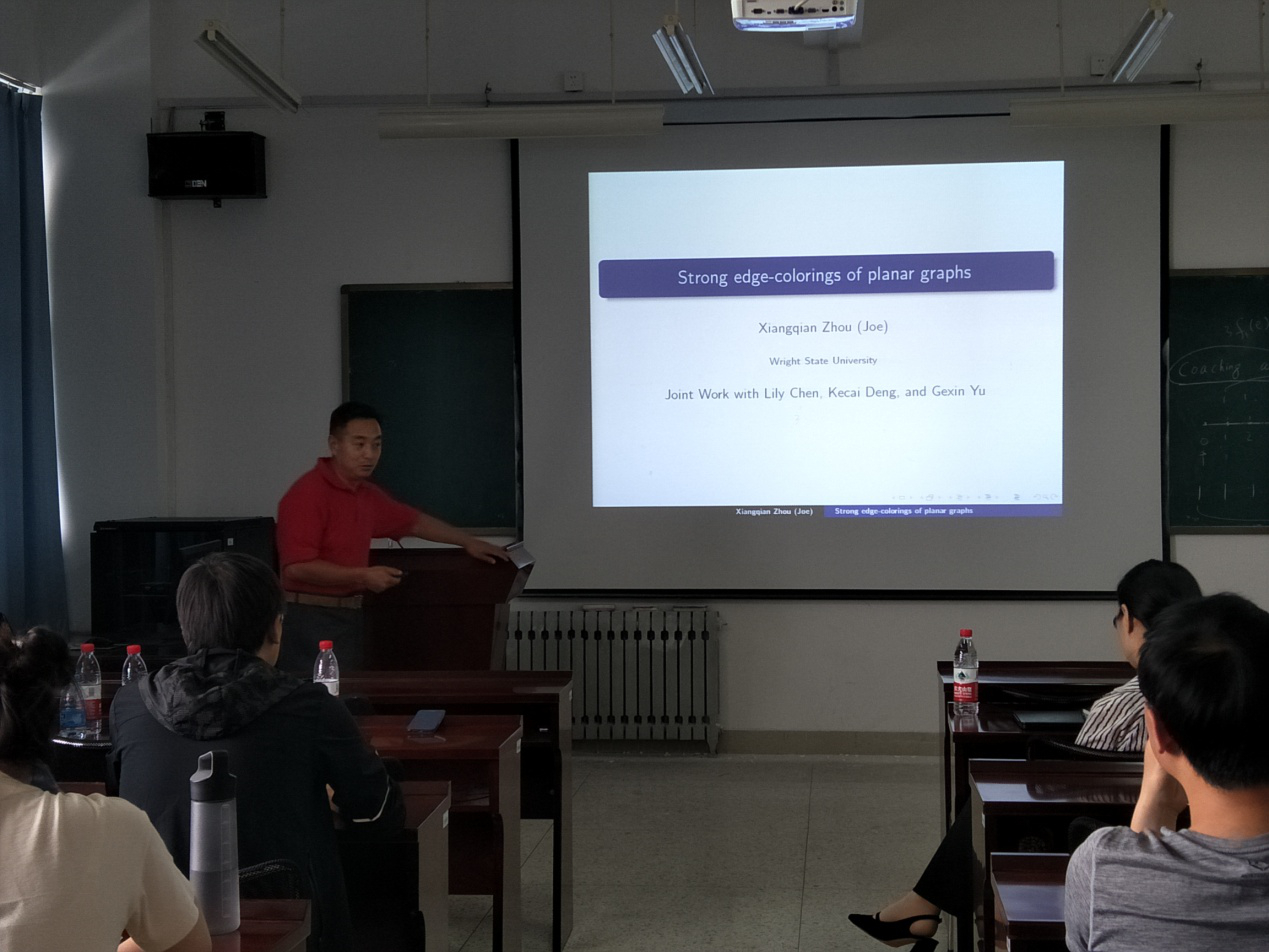 本站讯 2018年6月15日,美国莱特州立大学(Wright State University, USA)数学与统计系副教授周向前应邀访问pg电子,开展了题为“平面图的强边染色”的学术报告,学院部分师生参加了此次报告。