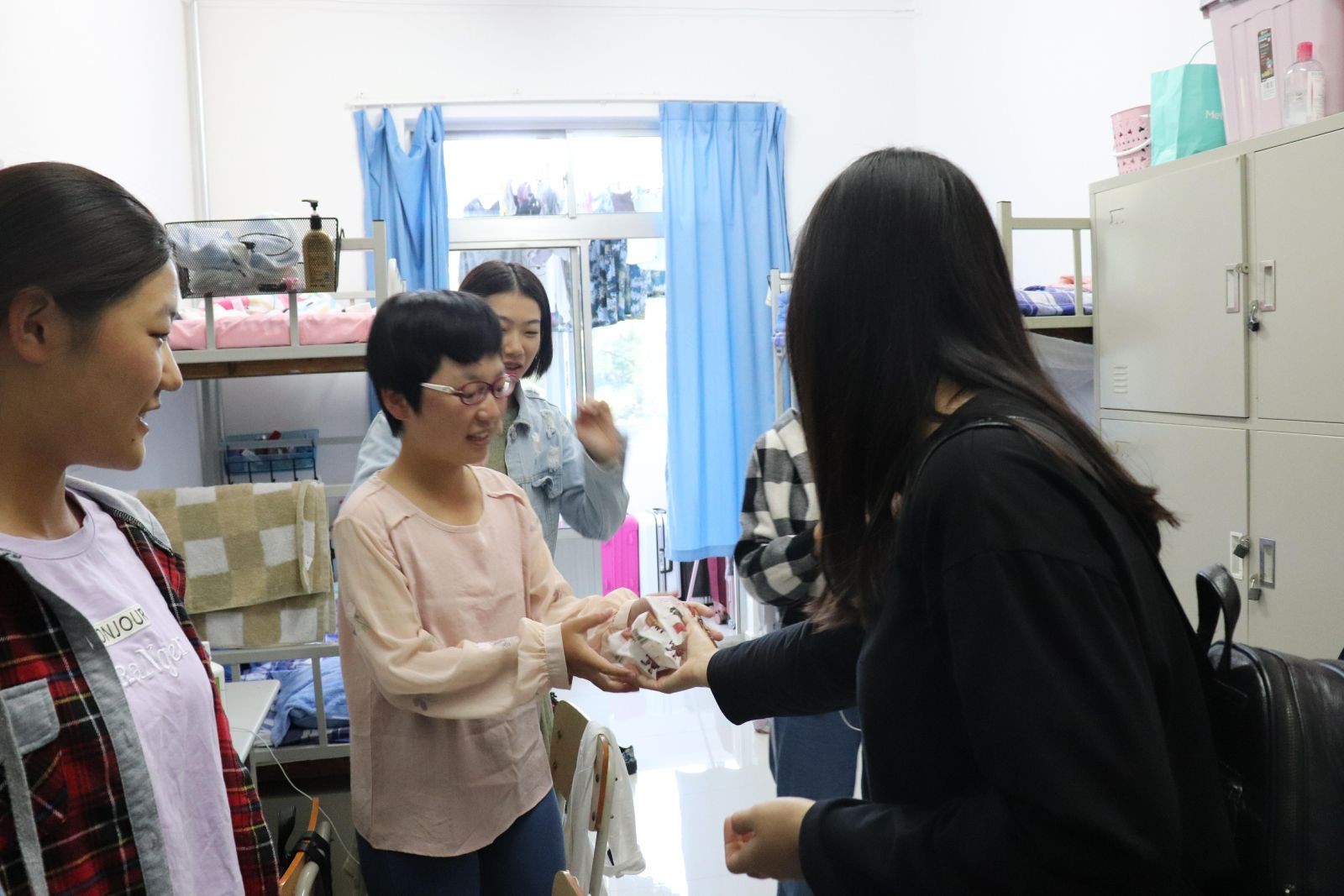 在传统节日中秋节来临之际,王鹏飞、孙磊对2018级新生进行了宿舍走访,在走访过程中,王鹏飞对同学们的加入表示欢迎,表达了学院和老师对同学们的关心爱护之意,并祝福同学们中秋快乐,学业有成。向同学们表达慰问的同时,鼓励同学们再接再厉,积极参加学院、系部举办的各类活动,多交流、长见识、强能力,及时向学院和老师反映思想上的困惑、学习上的疑问、生活中的难处、工作中的困难等。提醒同学们在节日期间也不忘给父母家人表达问候。孙磊带领学生会学生干部们给每位新生送上月饼,慰问每位新生,鼓励大家树立明确目标,努力奋斗,积极创造属于自己的幸福生活。新生们对于节日突然的惊喜,宿舍气氛活跃,心里不仅开心还增加了一份感动,向老师和学长学姐也表达了他们自己的祝福,介绍自己的家乡特色和中秋习俗,分享在校期间的学习生活感受,感谢学院领导的关怀及老师和同学们的帮助,表示在今后的学习和生活中一定会坚定信心,积极上进,不断提高,以优异的成绩回报老师的培养之情和父母的养育之恩。