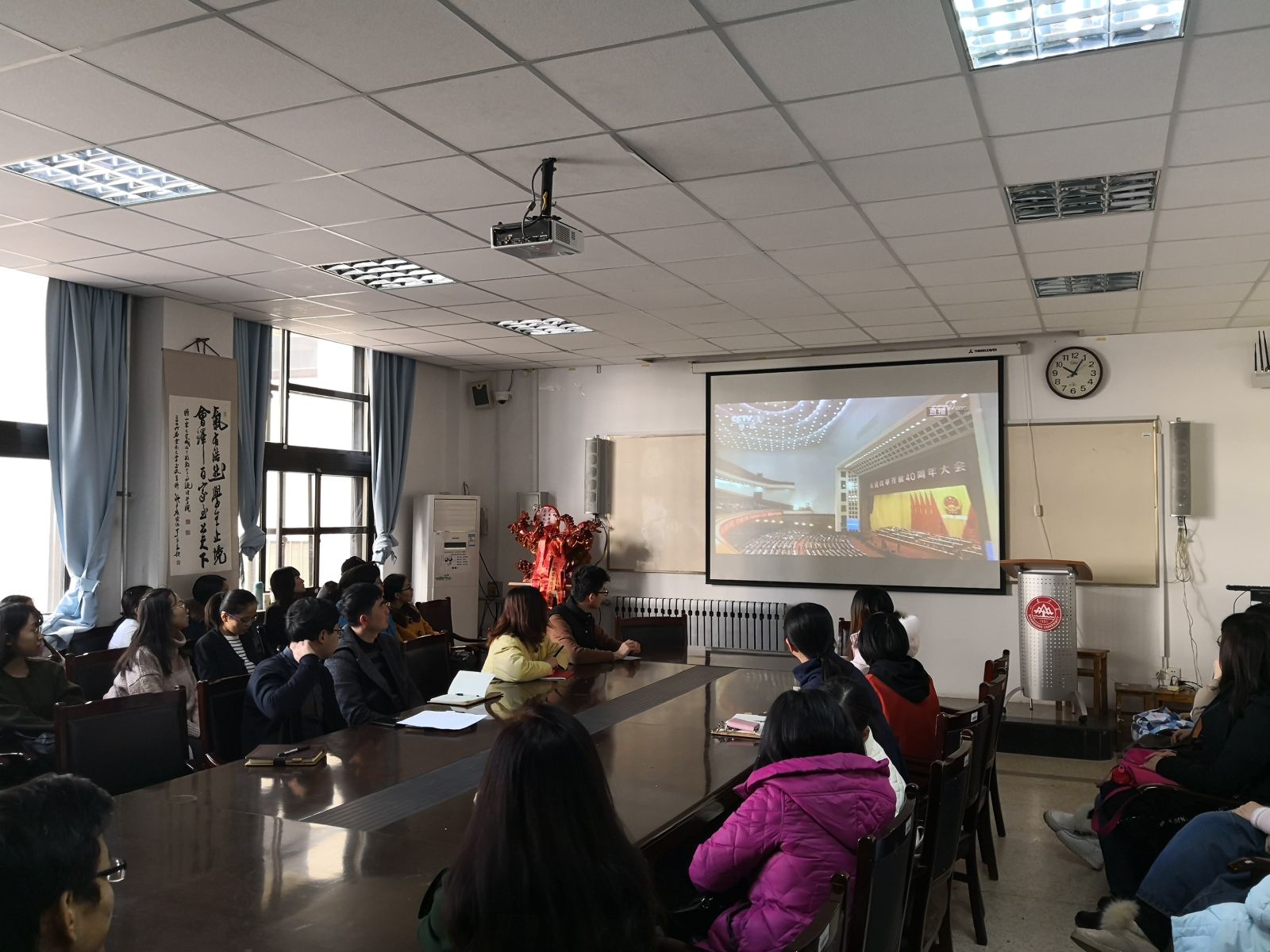本站讯 12月18日上午10时,在庆祝改革开放40周年大会隆重召开之际,pg电子于图东环楼208会议室组织师生党员集体观看了大会直播。