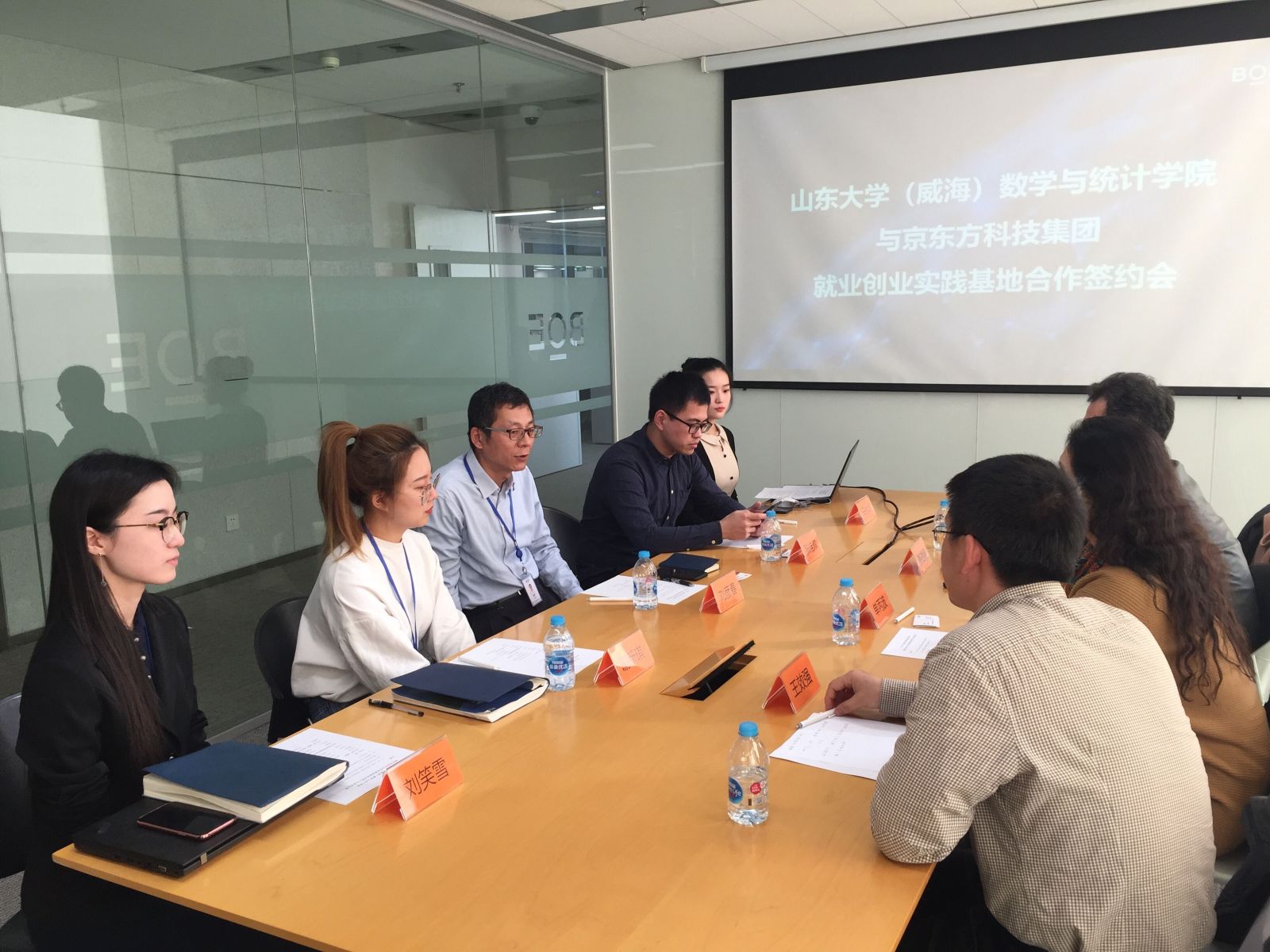 本站讯 为进一步加强校企合作交流,了解就业单位人才需求,拓宽学生实习就业渠道,12月17日,pg电子党委书记单丙波、常务副院长綦建刚、统计系主任王效强、辅导员王祎璠于北京走访了京东方科技集团股份有限公司和北京中体骏彩信息技术有限公司,并签署就业实践基地。