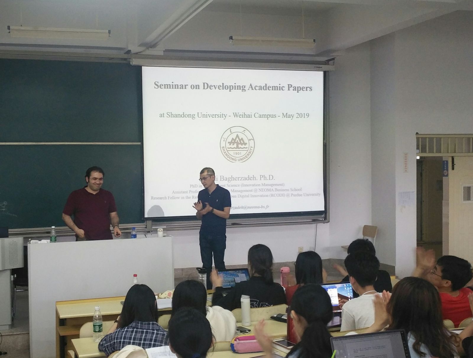 论坛开始前一周,Mehdi教授将讲座需要的一些资料通过网盘链接分享给大家,希望大家提前阅读并了解讲座背景,其中包括Stefan Markovic助理教授录制的视频讲解、Mehdi教授的初稿文章、提交文章以及相应期刊审稿的互相回复邮件、最终发表文章等资料。讲座伊始,Mehdi教授大体介绍了自己的研究领域与科研经历,随后Mehdi教授以他在期刊JOURNAL OF BUSINESS RESEARCH上发表的文章"How does breadth of external stakeholder co-creation influence innovation performance? Analyzing the mediating roles of knowledge sharing and product innovation"为例,将一篇论文合适的写作思路和框架构造进行了细致的讲解,除此之外,Mehdi教授以自己的回复评审意见为例,讲解投稿后如何应对期刊的多轮评审过程,如何按照评审意见修改论文,同时介绍了统计建模分析实例以及英文写作技巧。最后提问环节,同学们踊跃提问,Mehdi教授耐心解答了同学们提出的有关论文写作的问题,本次讲座到此结束。