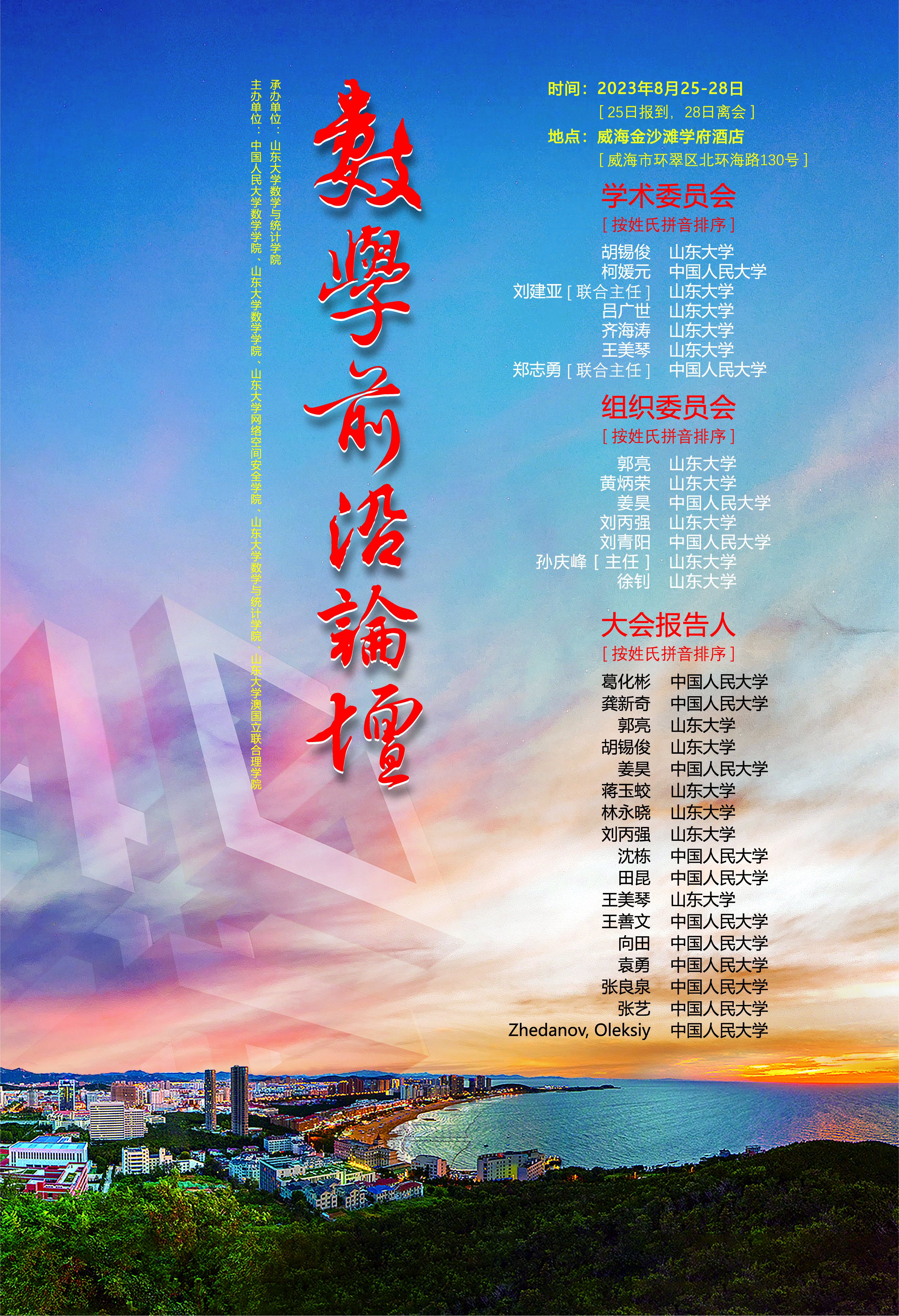 由中国人民大学数学学院、pg电子官方网站数学学院、pg电子官方网站网络空间安全学院、pg电子官方网站、pg电子官方网站澳国立联合理学院联合主办,pg电子官方网站承办的“数学前沿论坛”定于2023年8月25-28日在pg电子官方网站威海校区举行。本次论坛旨在促进数学学科发展,共同探讨数学核心方向的最新学术动态,增进相关领域专家、学者的学术交流。