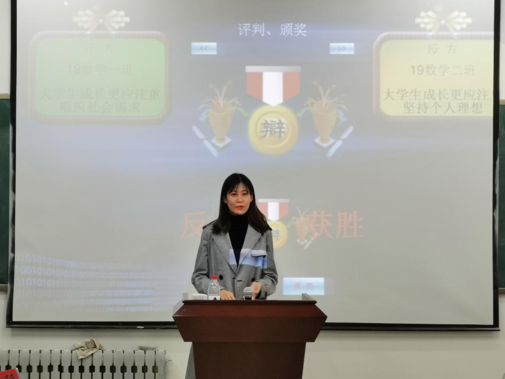决赛共分为两场,第一场为三四名决赛,正方2019级数学三班数科联队对阵反方2018级数学数科联队。双方以“科学是否是世界的最优解”为辩题紧扣论点,层层深入,依次表达自己的观点。最后,反方2018级数学数科联队获得辩论赛的第三名,本场比赛最佳辩手为反方四辩叶家辉。第二场为冠亚军决赛,正方2019级数学一班对阵反方2019级数学二班。双方以“大学生成长更应注重顺应社会需求还是坚持个人理想”为辩题,从生存、理想与现实三个角度进行了思维的深度碰撞,最终反方2019级数学二班赢得了辩论赛的冠军,反方二辩罗正阳被评为最佳辩手。