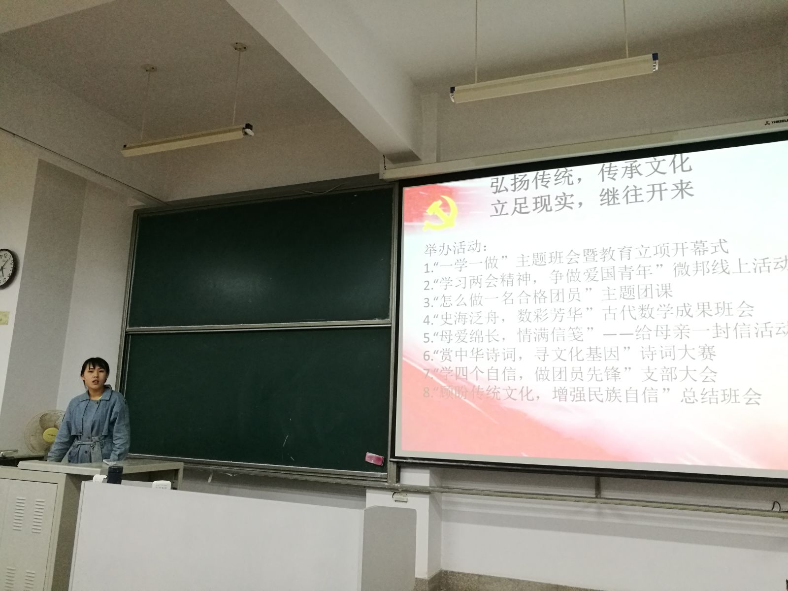 本站讯 2017年10月22日, 2016级信计班于商学院447教室举办“顾盼传统文化,增强文化自信”主题教育立项班会暨教育立项闭幕式。本次活动由孙妍主持,班级全体同学参与。