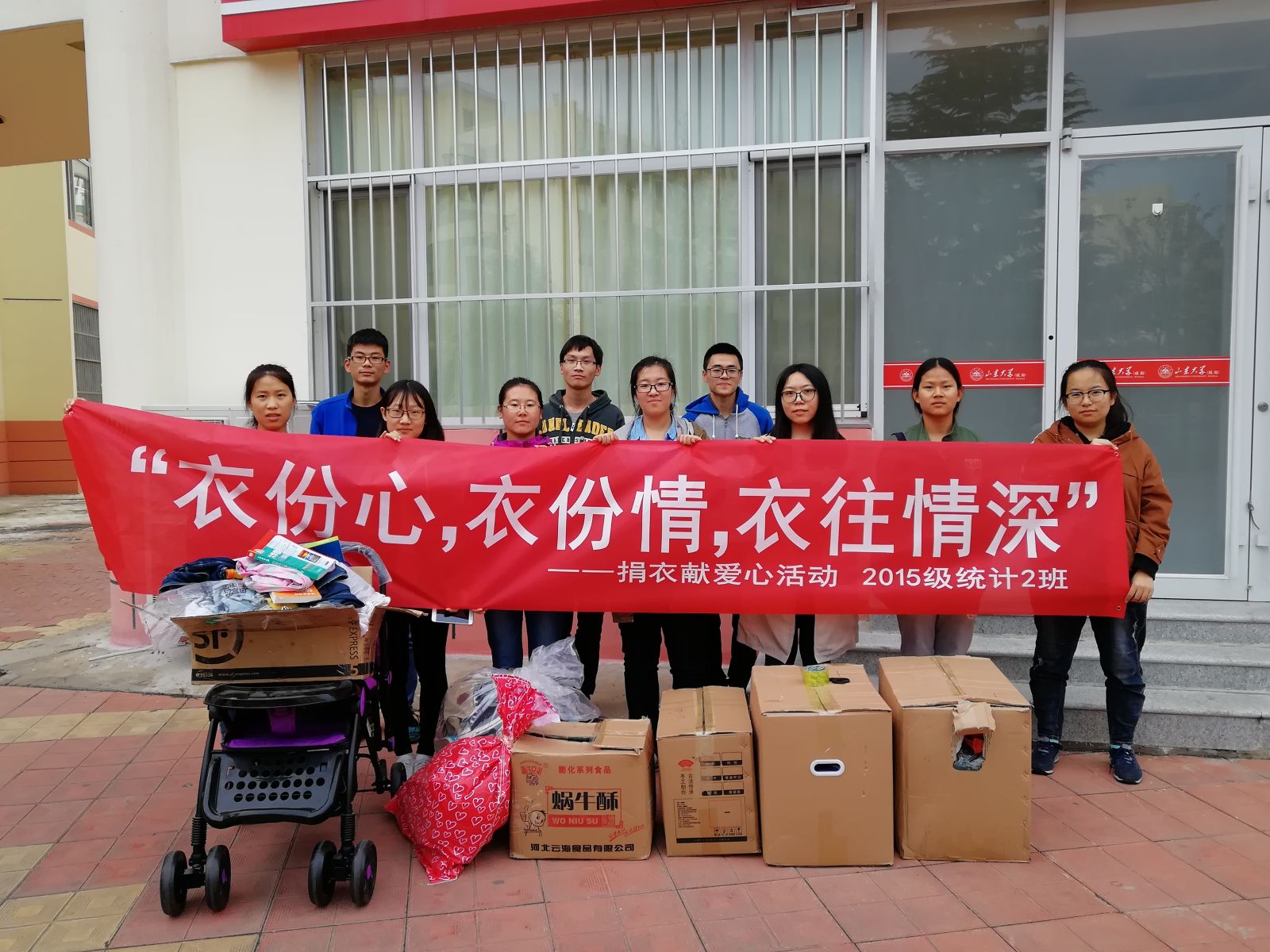 本站讯 2017年10月14日下午,2015级pg电子官方网站统计二班在五四广场举办“践行社会主义核心价值观,争做建设美丽中国螺丝钉” 主题教育实践活动,即“衣份心,衣份情,衣往情深”捐衣献爱心活动。统计二班全体成员参与其中。活动由班长赵若杉,团支书郝凯静共同主持。