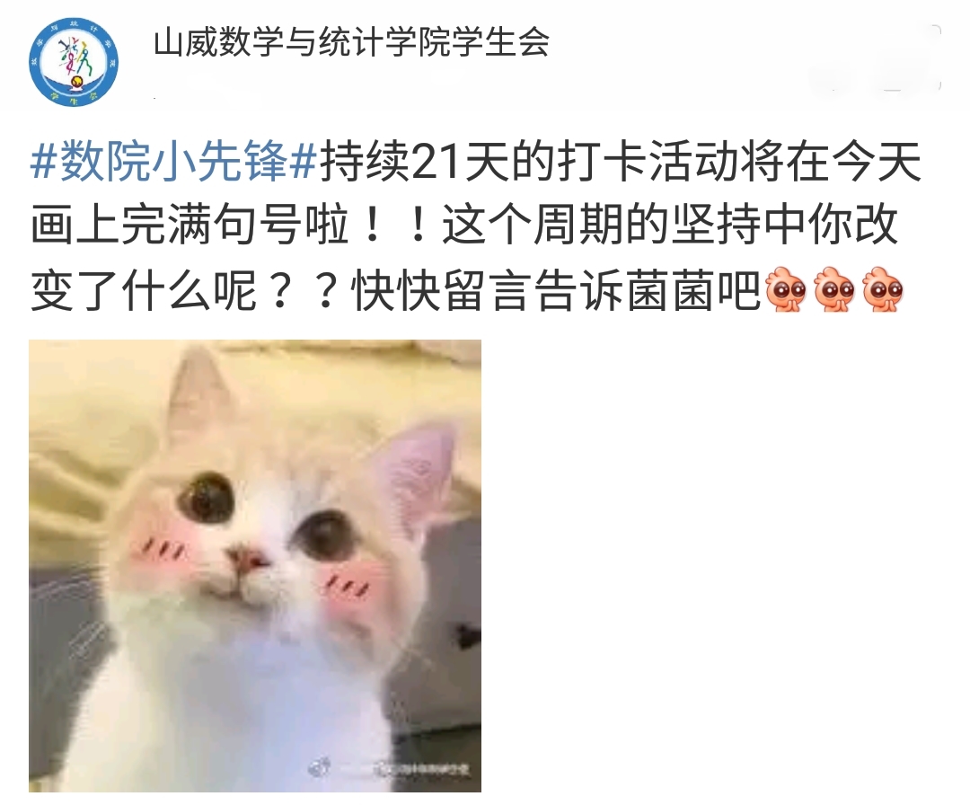 此次活动的形式是参与的同学在微博上进行打卡。同学们通过在微博话题#数院小先锋#下留言,记录自己每天的先锋行动,并@山威pg电子官方网站学生会。许多同学通过21天的不懈努力与坚持养成了新的生活好习惯。如每天坚持跑步锻炼身体,成为一名运动先锋;每天坚持上课不玩手机,成为一名学习先锋;每天坚持早起早睡,成为一名生活先锋等。微博打卡记录了同学们21天的心路历程,同学们从一开始的不适应到后来的慢慢习惯,每当想要放弃时回首过去每一天的点滴坚持,最终克服了自我的惰性养成了新的生活好习惯。这些同学模范践行了社会主义核心价值观,成为校园内广大团员学习的标杆,发扬了先锋带头作用,真正落实了理论和实践相结合。活动体现了同学们牢固树立并且自觉践行“四个意识”,在学生群体中作出向党中央看齐、向习近平总书记看齐的表率。