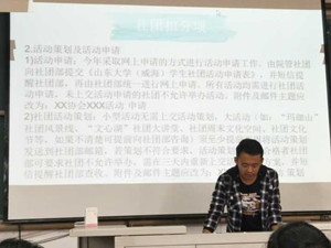 随着参会人员的有序就坐,王成宣布大会开始。首先,社团部部长、副部长以及五位干事上台做了简单的自我介绍,让社团的新干事们对社团部成员有了初步的了解。随后,王成部长以PPT的形式从日常文件格式和社团管理制度两个方面做了详细的介绍。部长王成就最近屡次出现的社团上交文件格式错误问题再次重申了活动通讯、活动通知等文件的格式,并以玛珈山风景线模拟数学建模大赛的活动通知及通讯向在坐人员做了简单的格式说明并强调了文件的注意事项。最后,王成又对社团考评制度中的扣分和加分向进行了详尽的阐述,使各社团对管理制度有了更加全面的了解。至此,社团理事团成员动员大会圆满结束。