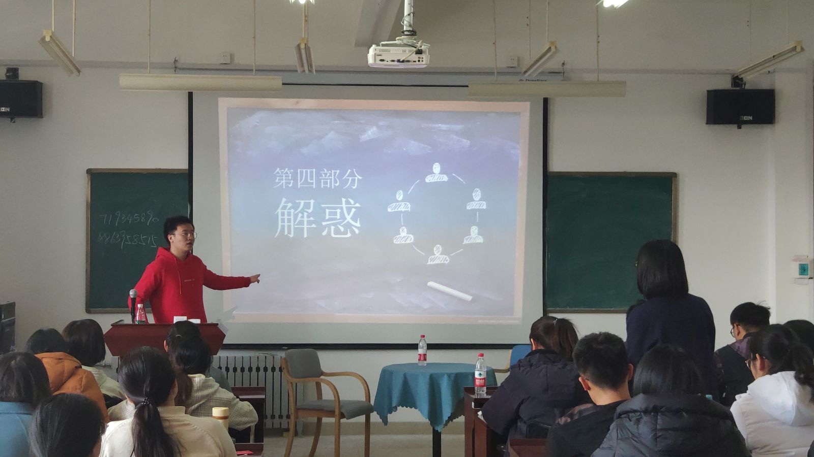 刘海凌向与会人员介绍了出席本次活动的嘉宾:雒宗辉,中共党员,连续四年担任2015级数学与应用数学班班长,以总成绩第一名考取中央银行选调生。活动流程主要分为“浅识”“广拓”“深探”“解惑”四个部分,兼有主持人访谈和经验介绍两部分。“浅识”部分中,雒宗辉向大家介绍了自己的大学时光及连续四年担任班长一职给他带来的收获与感悟。“广拓”部分中,他分享了自己在学习中遇到的困难以及解决困难收获成就的过程,并介绍了有关公务员考试的相关知识。雒宗辉在“深探”部分中根据自己的经历和经验给到场的同学详细介绍了公务员考试,并从中央选调、选调优选、省级选调等多个方面介绍了参选的所需条件、报名时间以及考试的科目难度等。此外,雒宗辉还强调了关于笔试与面试的区别以及如何有效地准备二者。最后,活动进入“解惑”环节,雒宗辉认真回答了各级同学有关学习、考研、保研和选调生的相关问题,和同学们分享了人生道路上关于选择、压力、努力和自信方面的见解。