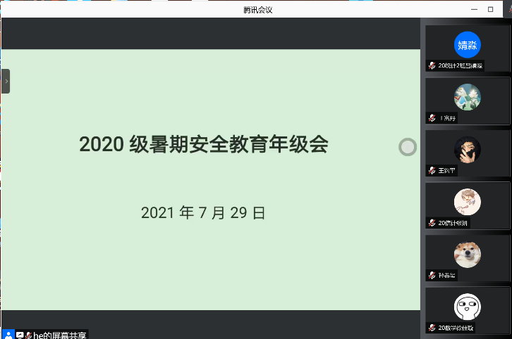 本站讯 为响应国家疫情防控政策,使学生合理、高效、安全地安排假期生活,贯彻学院“离校不离心,离校仍关怀”的方针。7月29日下午,pg电子官方网站开展了2020级线上暑期安全教育年级会。本次年级会由辅导员魏佳佳主持,2020级全体学生参与。