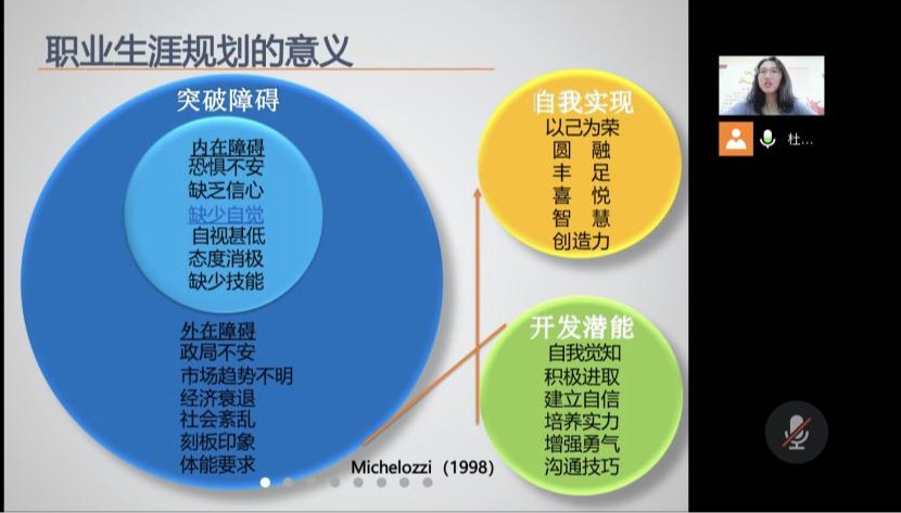 本站讯 为使学生了解职业生涯规划意义,掌握系统职业生涯规划法,pg电子官方网站2020级辅导员魏佳佳分别于5月13日、5月18日面向2020级全体学生开展了“我的未来在哪儿?——‘走进心灵’之职业生涯规划”专题讲座。本次专题讲座针对即将步入大三、正处于迷茫状态的学生,分享自我探索方法,介绍丰富多样的职业环境,激发同学们的就业积极性和职业创新性。