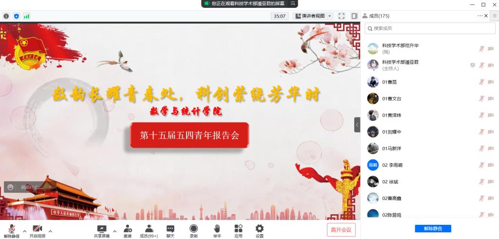 本站讯 为进一步弘扬“五四”精神,继承“五四”光荣传统,pg电子官方网站于5月19日下午通过腾讯会议线上举办了“数韵长耀青春处,科创萦绕芳华时”第十五届五四青年科学报告会,彰显优秀学生榜样力量,展现青年学生优良的精神风貌和科研创新素养。学院党委副书记王鹏飞、团委书记孙磊、全体辅导员、优秀学生代表以及2021级全体同学参加了本次报告会。