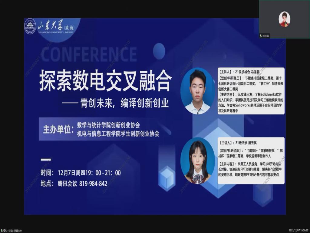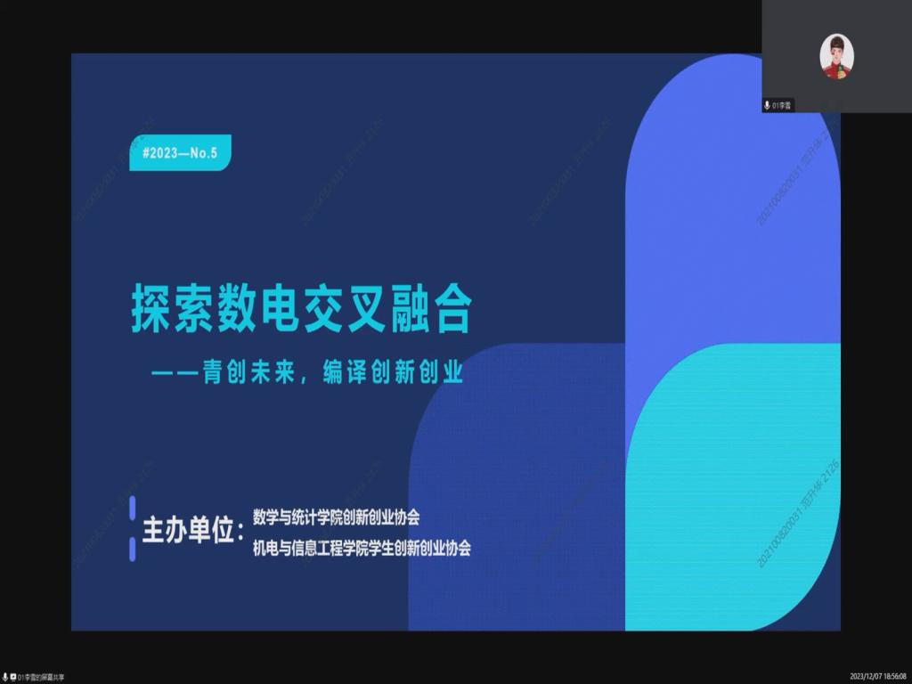 本站讯 数电交叉融合,编译创新创业。为了满足同学们对“硬”实力与“软”技能的学习需要,明晰学习方向,更好地参与到双创与科研活动中去,12月7日晚,pg电子官方网站创新创业协会联合机电与信息工程学院学生创新创业协会,于腾讯会议共同举办“探索数电交叉融合——青创未来,编译创新创业”主题讲座。来自pg电子官方网站、机电与信息工程学院等4个学院共100余名学生参加活动。