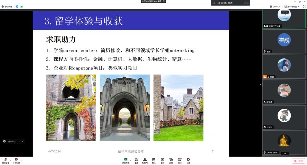 继第二十二期“励志周末”活动向学生普及留学申请流程及相关准备后,本次“天南地北数学人”活动继续聚焦留学主题,为学生搭建了与往届优秀校友对话的平台,帮助学生走近真实的留学生活,了解留学后继续深造或回国求职的宝贵经验,为有留学意向的学生提供了循序渐进、科学有效的生涯指导。