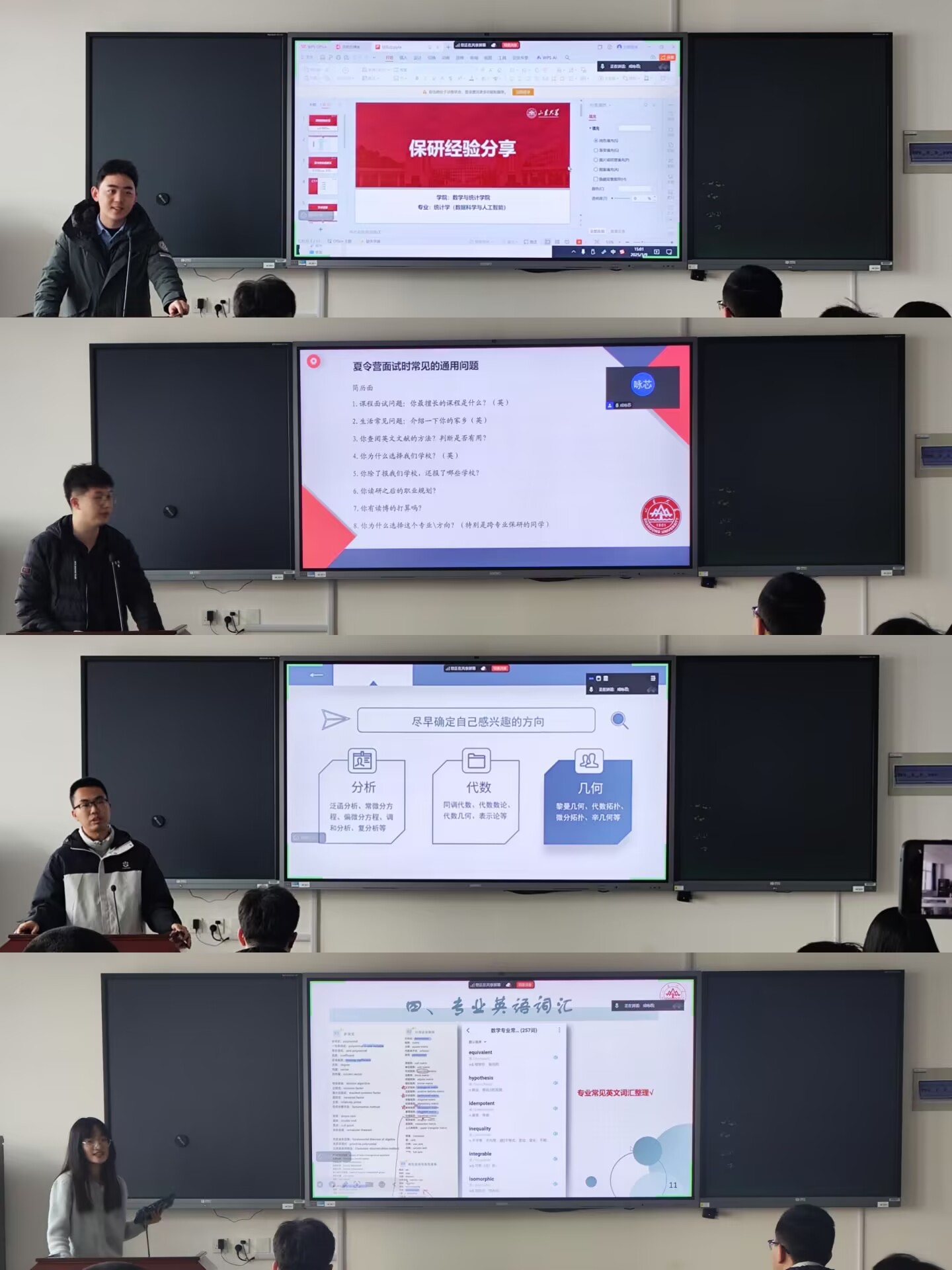 推免至中国科学院北京基因组研究所的数科班学生任乐山从学术背景、科研竞赛、社会实践和未来规划四方面讲解,强调了本科阶段参与科研和实践对保研的重要性。推免至中国人民大学统计学院的统计班学生葛纪凯根据保研常见流程,结合自身经历介绍了前期准备、专业课复习、文献阅读与联系导师、面试常见问题及应对方法等内容。推免至pg电子官方网站数学国家高层次人才培养中心的数学班学生曹昆针对基础数学方向,分享确定兴趣方向、选择导师与院校的方法,以及笔试面试注意事项。推免至西安交通大学pg电子官方网站的统计班学生潘亚君介绍了保研时间规划、通知查询、文书撰写与面试应对技巧,并分享了缓解紧张心态的实用方法。分享结束后,同学们积极与四位分享嘉宾交流,围绕专业选择、面试技巧等问题展开热烈讨论,现场气氛活跃。