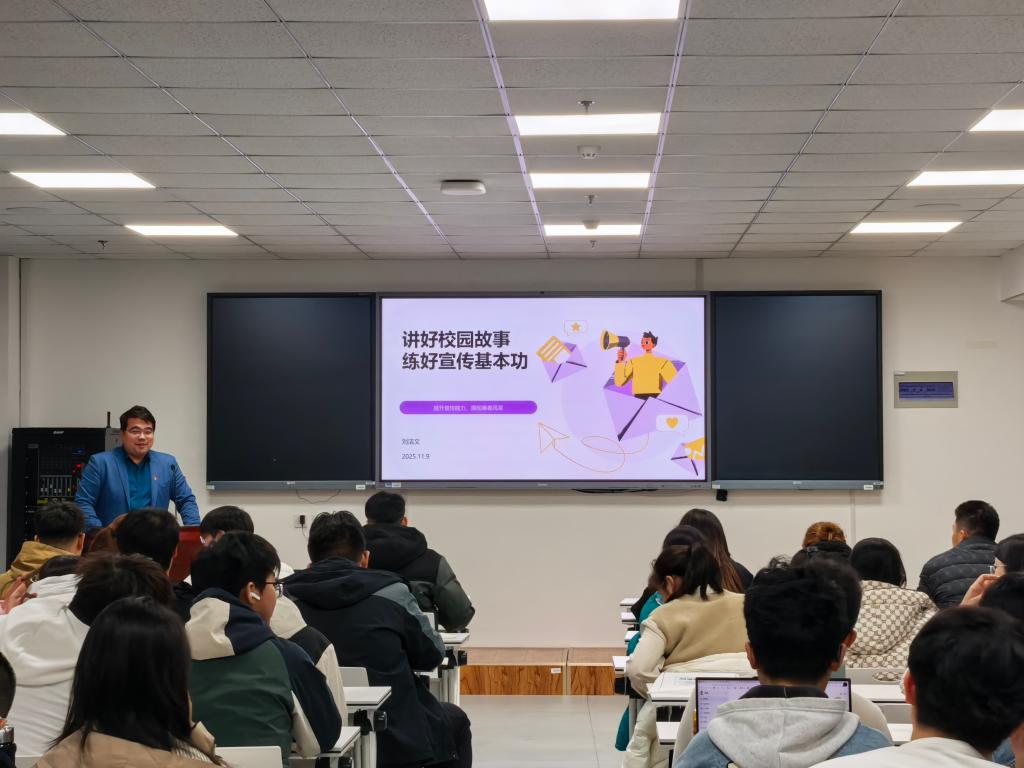 本站讯 为切实提升学生骨干的宣传工作专业素养,pg电子官方网站第十届“领航计划”学生骨干成长训练营第三期于11月9日晚上在北衡楼1420室举行。辅导员刘洁文以“讲好校园故事,练好宣传基本功”为主题,围绕宣传工作全流程实操要点开展专题分享。2024级、2025级班长、团支书、宣传委员、学团部长及部分志愿者共同参与。