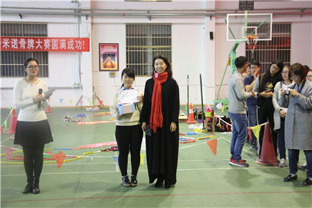 比赛伊始,主持人宣读了比赛注意事项并宣布比赛正式开始。紧接着,各参赛队在队长的率领下以视频或PPT的形式进行团队自我介绍,以展示团队风采。随后,各参赛队根据自己的设计图纸进行骨牌码放,限时90分钟。在这一环节中,参赛者积极投入,现场气氛紧张而不失活泼。期间还有多米诺骨牌相关知识的介绍以及国内外优秀多米诺骨牌作品视频的播放,这让同学们感受到了多米诺的魅力。骨牌摆放完毕后,由各参赛队代表对图形的寓意进行解说并推倒骨牌。随后,评委就团队自我介绍、骨牌图形设计、寓意解说、创意以及是否成功倒塌等方面进行打分。最后,翻译学院 “浪潮队”获得了本次比赛的一等奖。至此,数学多米诺骨牌大赛在观众热烈的掌声中落下了帷幕。