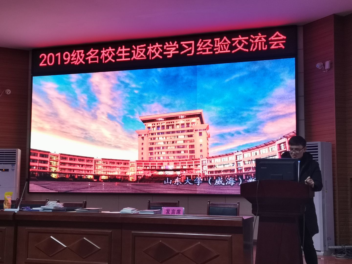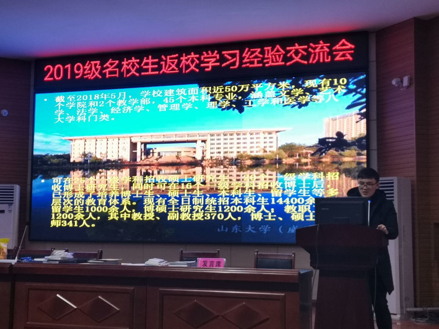 在正式回访前,本团队与其他返校宣讲团队与舞钢市第一高级中学诸位领导协商,最终确定于1月15日上午在学校报告厅进行宣讲。由于宣讲开始时间与放学时间相同,且舞钢市第一高级中学规定学生自愿前往听取宣讲。为吸引更多学弟学妹前往报告厅听取宣讲,本团队与其他返校宣讲团队合作,共同劝说同学们前往报告厅,吸引了大量学生前来听讲。本团队成员向学弟学妹们重点介绍了pg电子官方网站的本科教育、一校三地八校区的发展战略及pg电子官方网站威海校区在河南省的历年录取情况,同时还向学弟学妹们展示了pg电子官方网站厚重的历史文化底蕴以及威海作为宜居城市所拥有的优美环境、威海校区的国际化办学特色和浓厚的学术氛围。在宣讲过程中,宣讲人与学弟学妹们的互动较为频繁,宣传效果明显。宣讲结束后,团队成员向学弟学妹们发送了印有pg电子官方网站威海校区校园美景的明信片及其它小礼品,并与学弟学妹们进行面对面的交流。至此,团队走访舞钢市第一高级中学的活动结束。