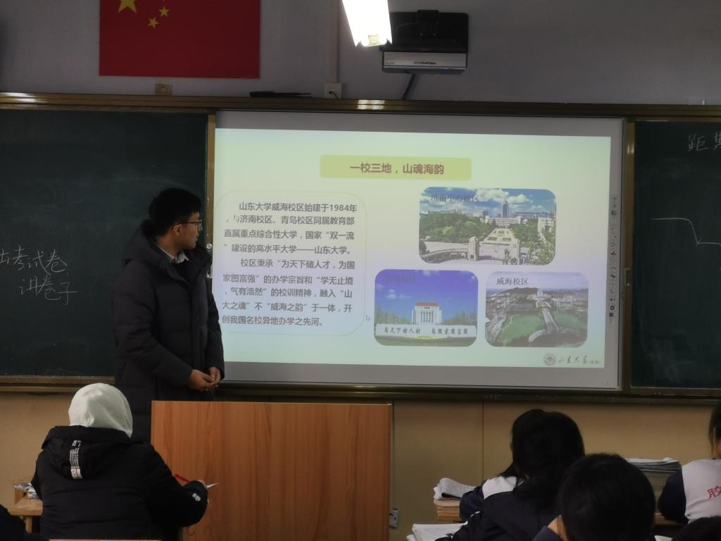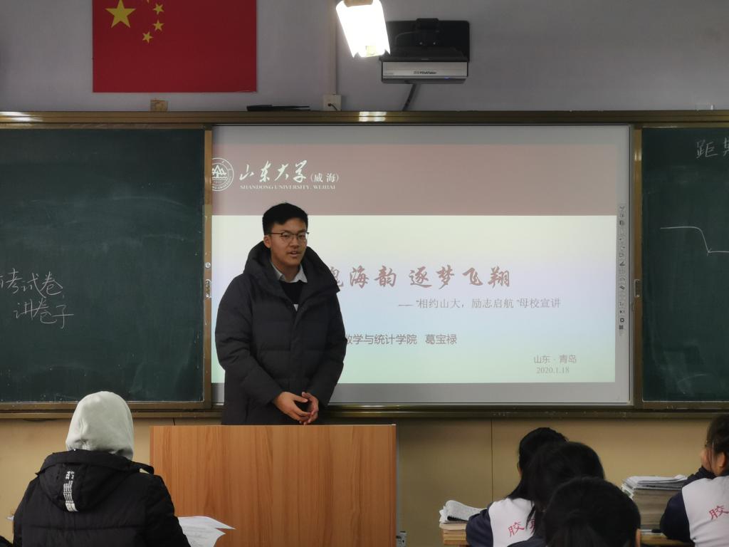 本站讯 1月18日16:30,“相约山大·励志启航”pg电子官方网站(威海)优秀学子母校行“涌浪”队队员葛宝禄回到母校胶南市第一中学进行宣讲。本次宣讲是向高中的学弟学妹们介绍pg电子官方网站(威海),吸引更多学子来到我们美丽的山大,以及对他们即将面临的高考提出学习建议,祝愿他们高考取得优异成绩。