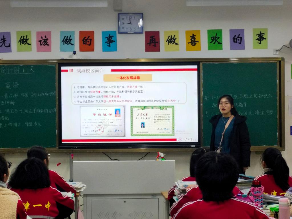 本站讯 2020年1月18日晚20:30,pg电子“崴路有你·圆梦山大”实践队王肖晴、杨晨两名队员于山东省德州市宁津县第一中学高三12班进行宣讲活动。高三12班班主任及全体同学参加了此次活动。