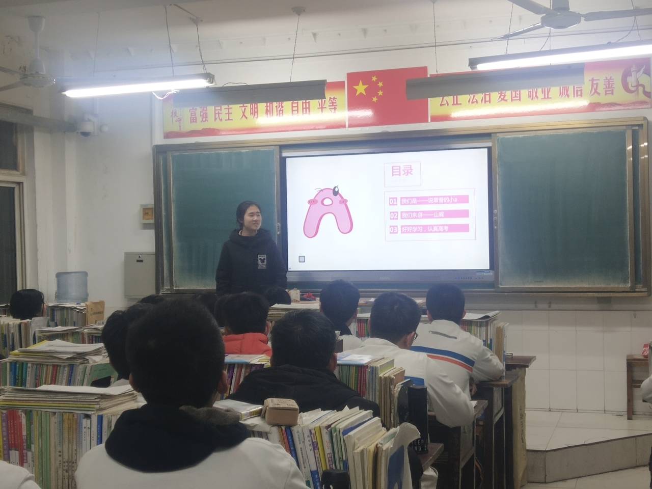 走访开始前,团队联系了选科为物理、化学、地理班级的班主任王老师,并约好准确的时间。在实践过程中,队员们与老师同学们进行交谈。团队成员与高中生面对面介绍了其测评系统、公众号的内容及使用方法,并从各自的亲身经历出发,为高中生们讲述高考备考经验。对于高中生提出的问题,团队成员分条举例给予了详细而真切的回答。除此之外,任课老师还针对团队研究的课题给予方向上的指导意见,也表述了18级因选科而存在的生物老师任务重而物理老师负责班级少的问题,并向团队表达了再次合作的意愿。最后,团队两名成员与同学校老师合影留念。至此,实践活动结束。
