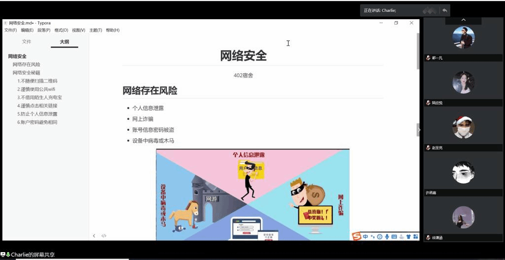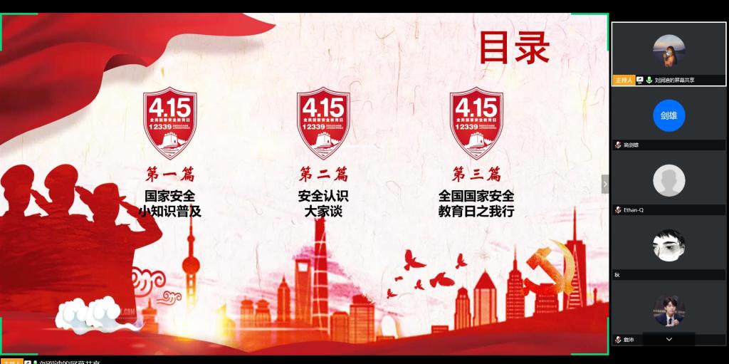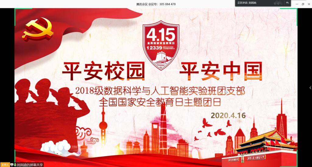 本站讯 为响应第五个全国国家安全教育日宣传活动的号召,提高同学们关于个人和国家安全的意识,4月16日下午,2018级数据科学班开展以“平安校园,平安中国”为主题的线上团日活动。本次会议由团支部书记刘润迪主持,全体同学参与了活动。