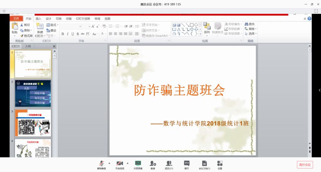 本站讯 2020年3月25日下午四点半,pg电子官方网站(威海)pg电子官方网站2018级统计一班于线上举办防疫期间第六次线上主题班会,本次线上班会为防诈骗主题班会,旨在提醒班级同学要警惕诈骗,注意人身财产安全。本次班会由团支书秦千主持,统计一班全体成员参加。
