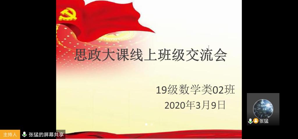 本站讯 2020年3月9日下午,“全国大学生疫情防控思政大课”结束后,pg电子官方网站2019级数学02班通过腾讯会议线上直播,开展了寒假“疫情防控思政大课感悟与总结”主题班会。班长张猛主持此次班会,pg电子官方网站2019级辅导员王祎璠、2班全体同学参加。