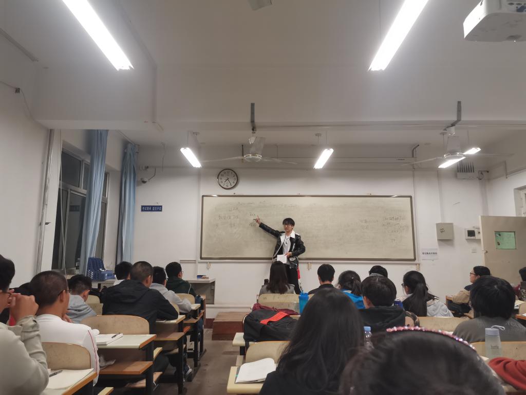 本站讯 10月15日晚,2019级数学类1班于文化传播学院402教室举办学长讲课活动。辅导员王祎璠、赵呈海同学、新生班主任夏炳权、2019级数学类1班全体学生参加了此次活动。