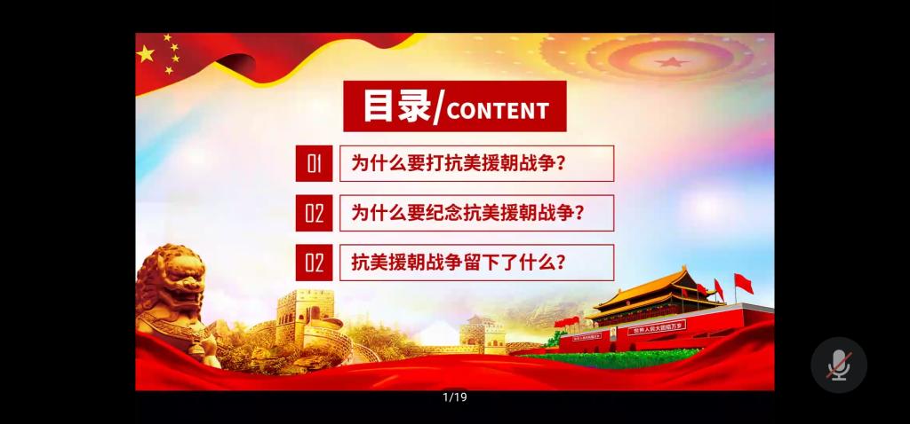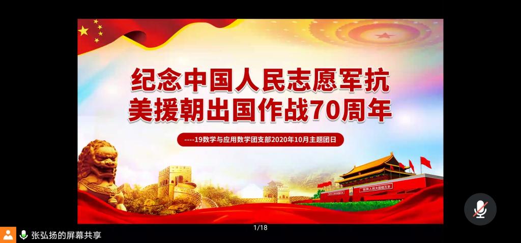本站讯 2020年10月26日下午14:00,pg电子官方网站2019级数学与应用数学班于线上开展了主题团日活动,主题为“纪念中国人民志愿军抗美援朝出国作战70周年”。团支书张弘扬主持此次会议,数学与应用数学班全体同学参加。