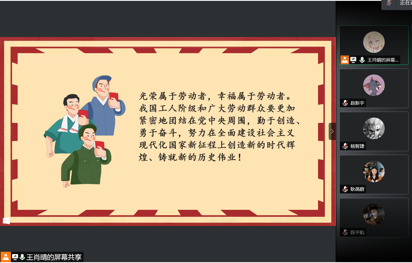本次活动主要分为四个部分。王肖晴首先向大家介绍了劳动的定义,以及“爱岗敬业、争创一流、艰苦奋斗、勇于创新、淡泊名利、甘于奉献”的劳动模范精神。在有了对劳动的基础认知后,王肖晴向大家介绍了劳动教育的内容及意义,并指出劳动教育是中国特色社会主义教育制度的重要内容,它直接决定社会主义建设者和接班人的劳动精神面貌、劳动价值取向和劳动技能水平。简单介绍后,大家一起观看了“你知道一个小时的劳动有多大的价值吗?”、“致敬‘平凡而伟大’的劳动者”、“致敬每一位用心的劳动者”三个视频,并向劳动者致敬。同学们还一起学习了习近平总书记在全国劳动模范和先进工作者表彰大会上的讲话,在讲话中,习近平总书记呼吁我国工人阶级和广大劳动群众要更加紧密地团结在党中央周围,勤于创造、勇于奋斗,努力在全面建设社会主义现代化国家新征程上创造新的时代辉煌、铸就新的历史伟业!