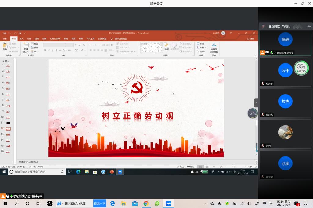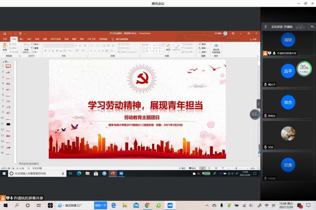 本站讯 3月20日下午15:00,pg电子官方网站2019级统计学二班开展“学习劳动精神,展现青年担当”主题团日活动,本次主题团日活动以线上会议的形式进行。本次会议由团支书乔靖轶主持,2019级统计二班全体同学参加。