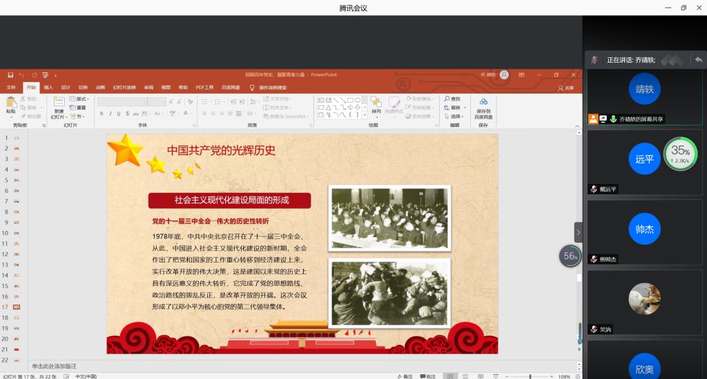 本站讯 3月24日下午17:00,pg电子官方网站2019级统计学二班开展“回顾百年党史,凝聚青春力量”主题团日活动,本次主题团日活动以线上会议的形式进行。本次会议由团支书乔靖轶主持,2019级统计二班全体同学参加了本次活动。
