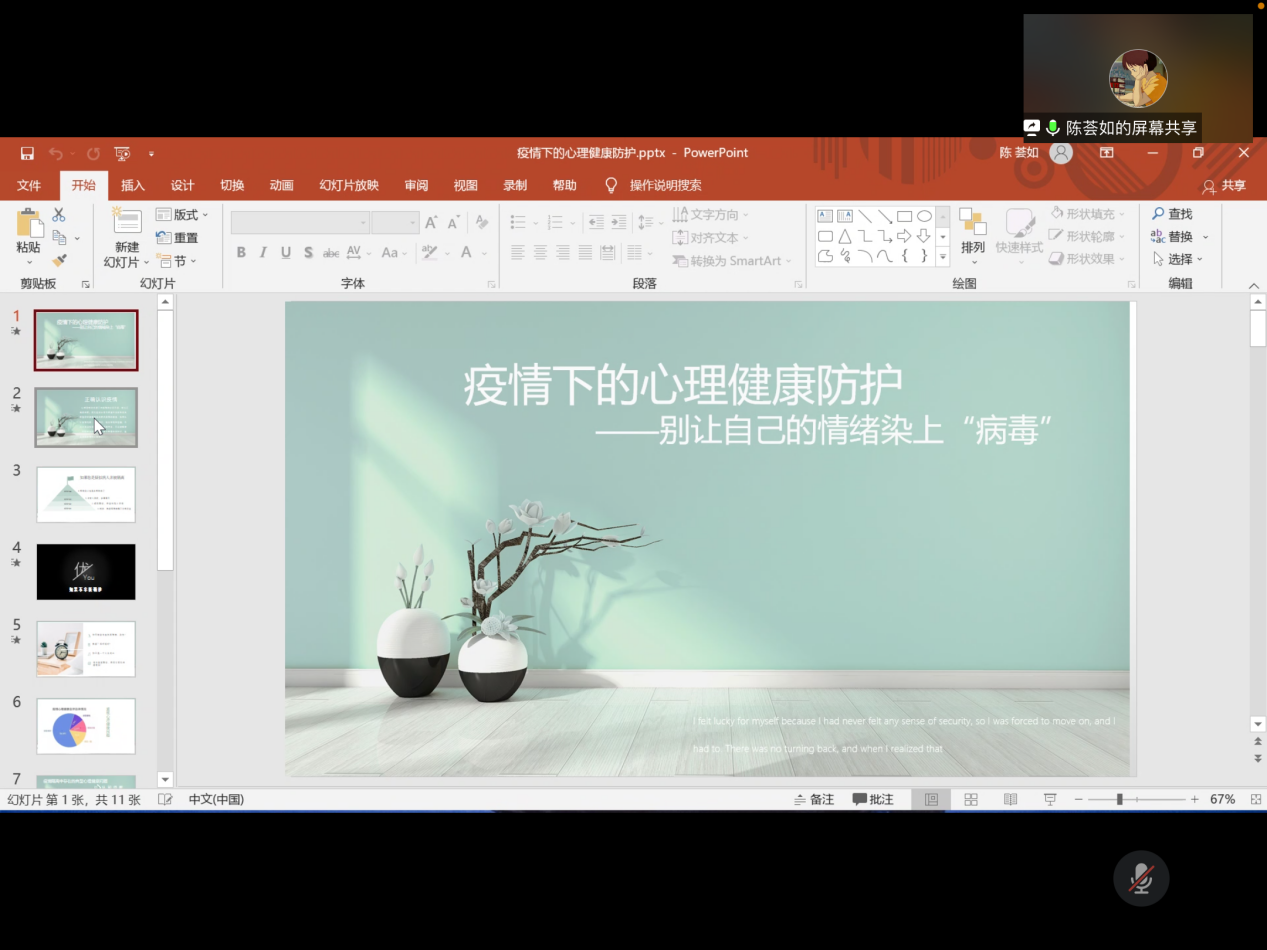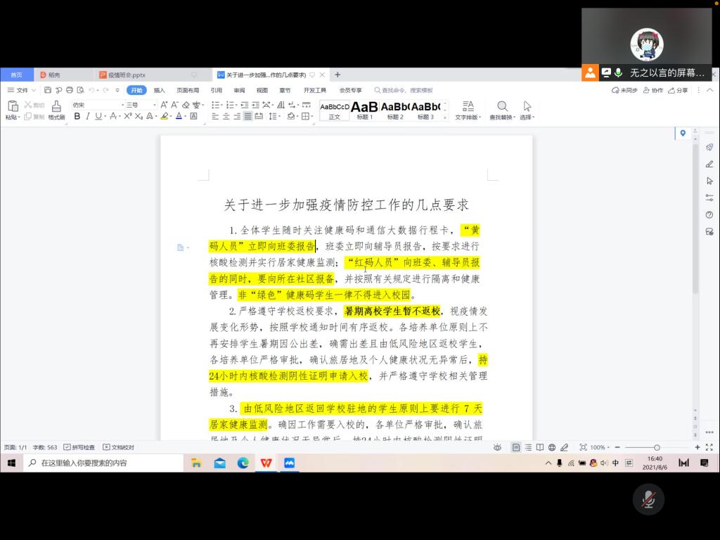 针对近期疫情形势,张嘉伟分别就防范德尔塔毒株和进一步加强疫情防控工作的要求进行了详细的说明。张嘉伟提出,新冠变异病毒德尔塔毒株传染性增强,传播已广泛,但疫苗仍有效;避免“突破感染”,尽量避免前往中高风险区,积极接种新冠疫苗;提出进一步加强疫情防控工作的几点要求:全体学生随时关注健康码和通信大数据行程卡、暑期离校学生暂不返校、在校生暂不离校。张嘉伟着重强调了建立“辅导员-班委-舍长-同学”四级网格化机制,实行网格化管理。随后孙善玺和陈荟如针对疫情下的心理健康防护,提出“别让自己的情绪染上‘病毒’”。孙善玺和陈荟如提出,正确认识疫情,不轻信传言,不过度解读,积极关注防控信息;重视心理健康问题,正确认识疫情隔离中存在的典型心理健康问题;积极疏导,缓解焦虑,及时寻求专业帮助。